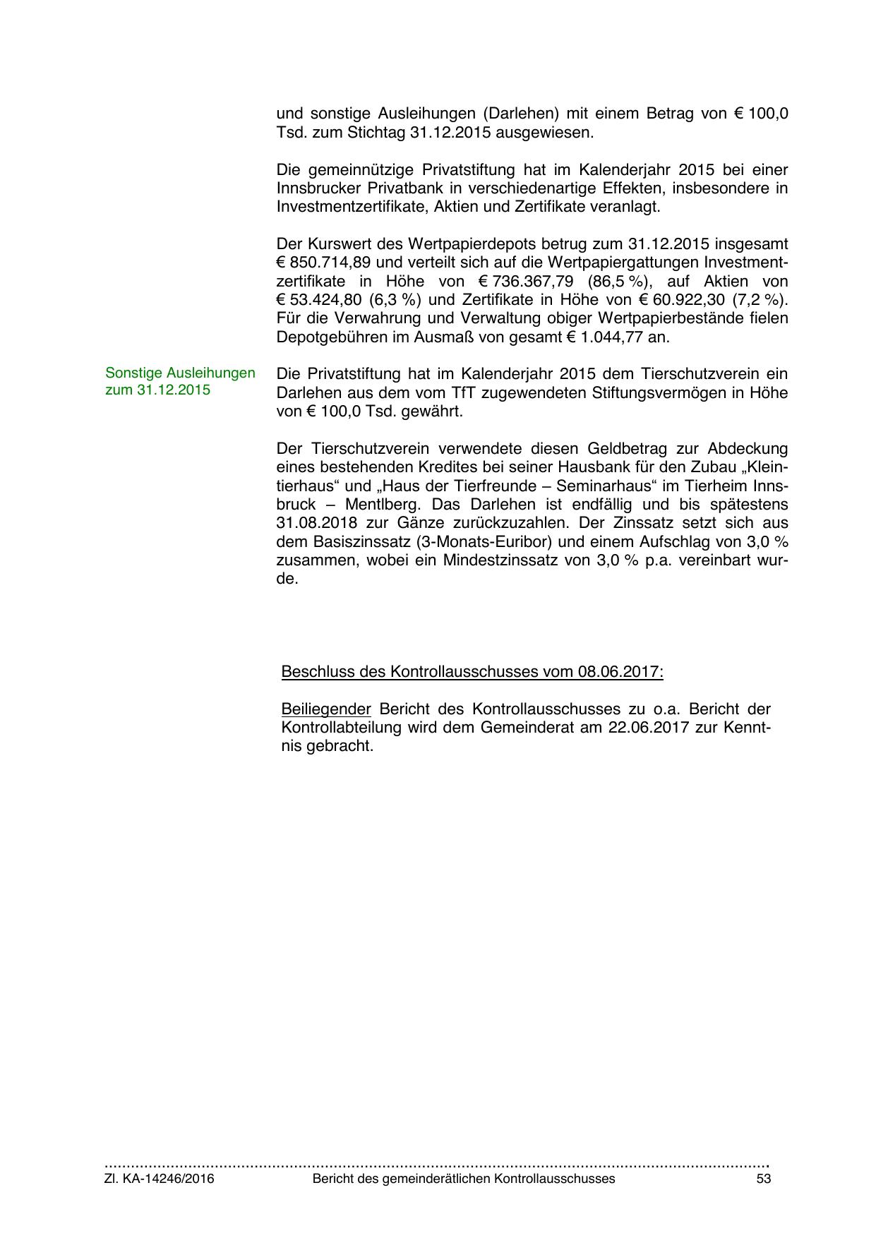 eines bestehenden Kredites bei seiner Hausbank für den Zubau „Kleintierhaus“ und „Haus der Tierfreunde – Seminarhaus“ im Tierheim Innsbruck – Mentlberg. Das Darlehen ist endfällig und bis spätestens