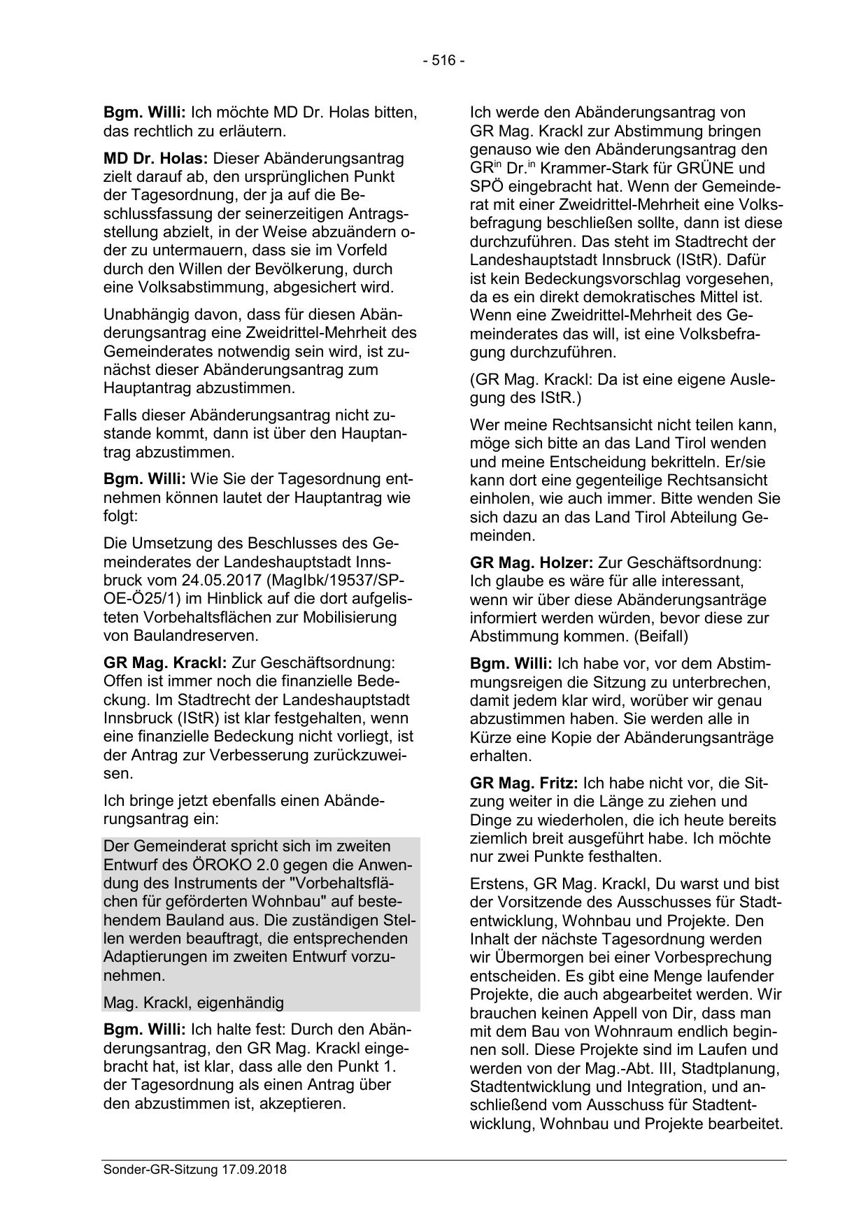 Bgm. Willi: Ich habe vor, vor dem Abstimmungsreigen die Sitzung zu unterbrechen,