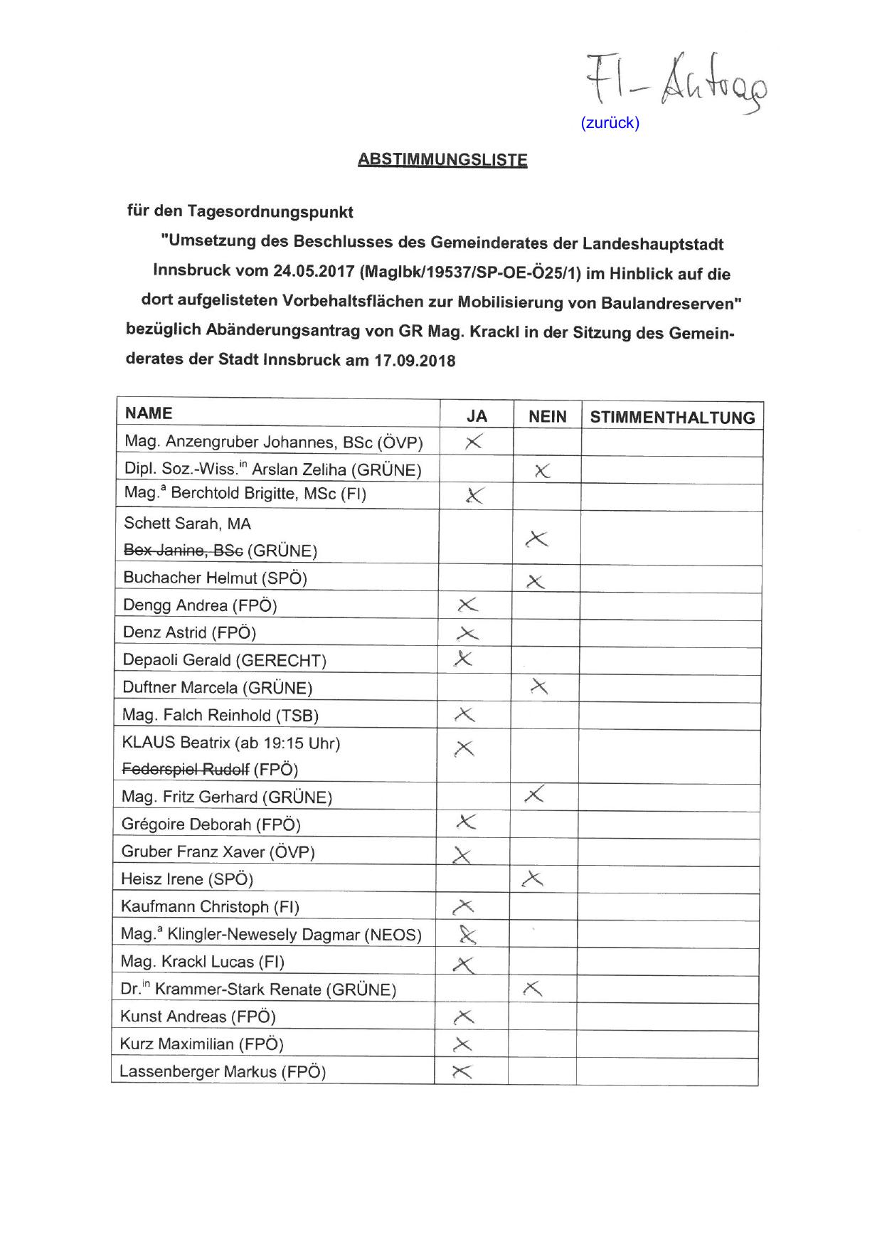 bezüglich Abänderungsantrag von GR Mag. Krackl in der Sitzung des Gemeinderates der Stadt Innsbruck am 17.09.2018