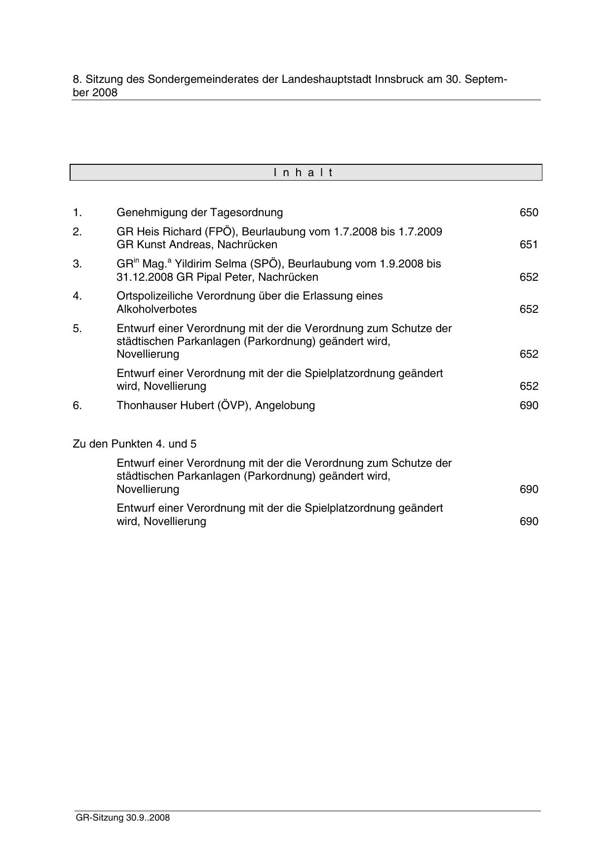 8. Sitzung des Sondergemeinderates der Landeshauptstadt Innsbruck am 30. September 2008