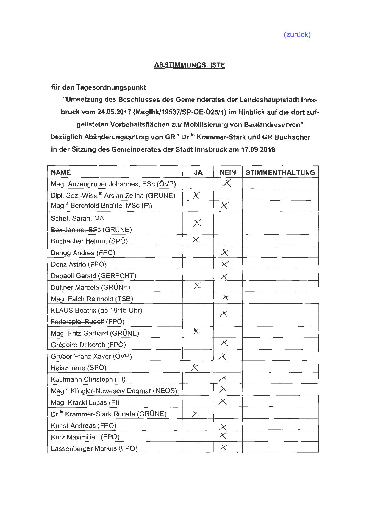 "Umsetzung des Beschlusses des Gemeinderates der Landeshauptstadt Innsbruck vom 24.05.2017 (Maglbk/19537/SP-OE-Ö25/1) im Hinblick auf die dort aufgelisteten Vorbehaltsflächen zur Mobilisierung von Baulandreserven"
