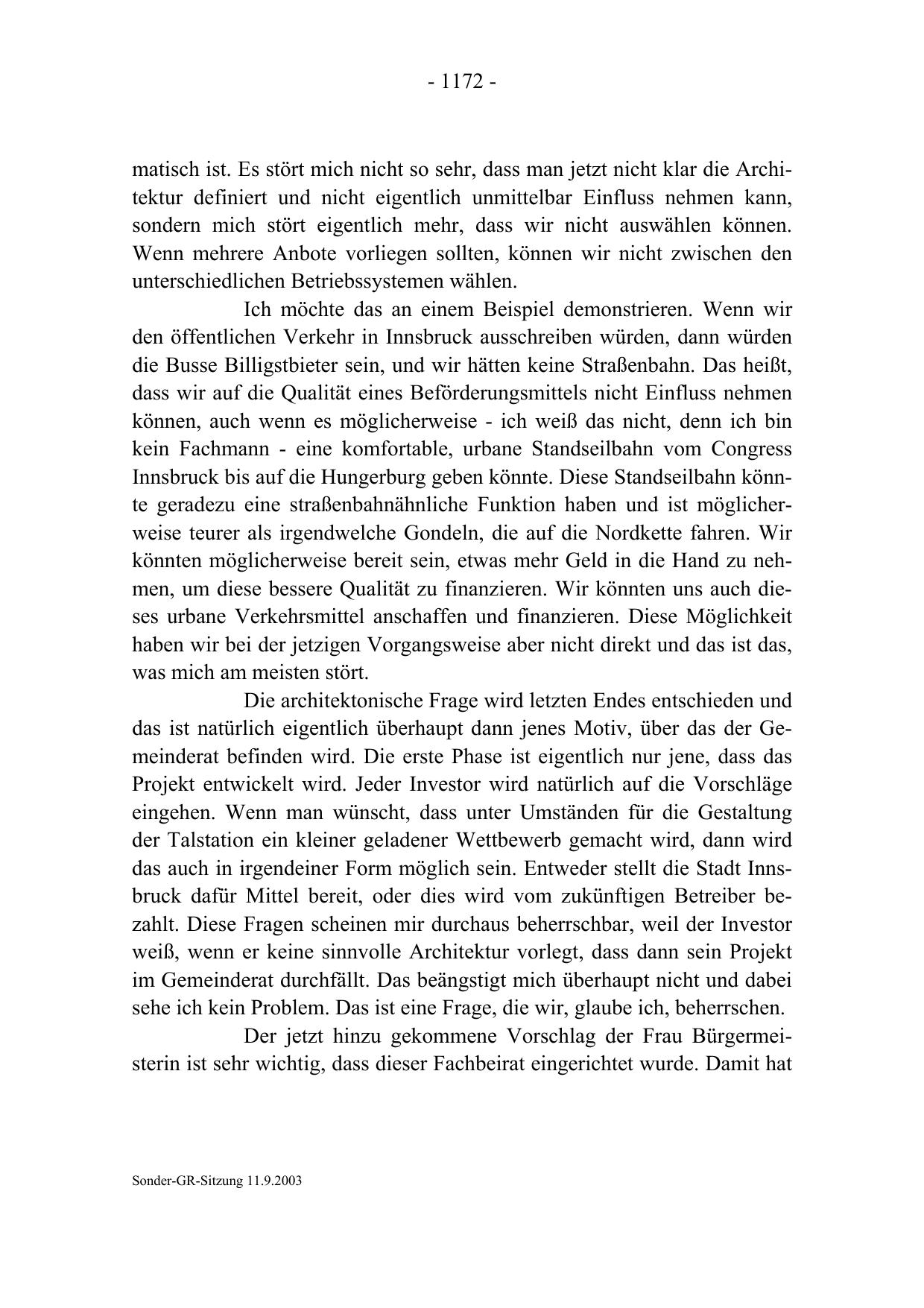 Innsbruck bis auf die Hungerburg geben könnte. Diese Standseilbahn könnte geradezu eine straßenbahnähnliche Funktion haben und ist möglicherweise teurer als irgendwelche Gondeln, die auf die Nordkette fahren. Wir