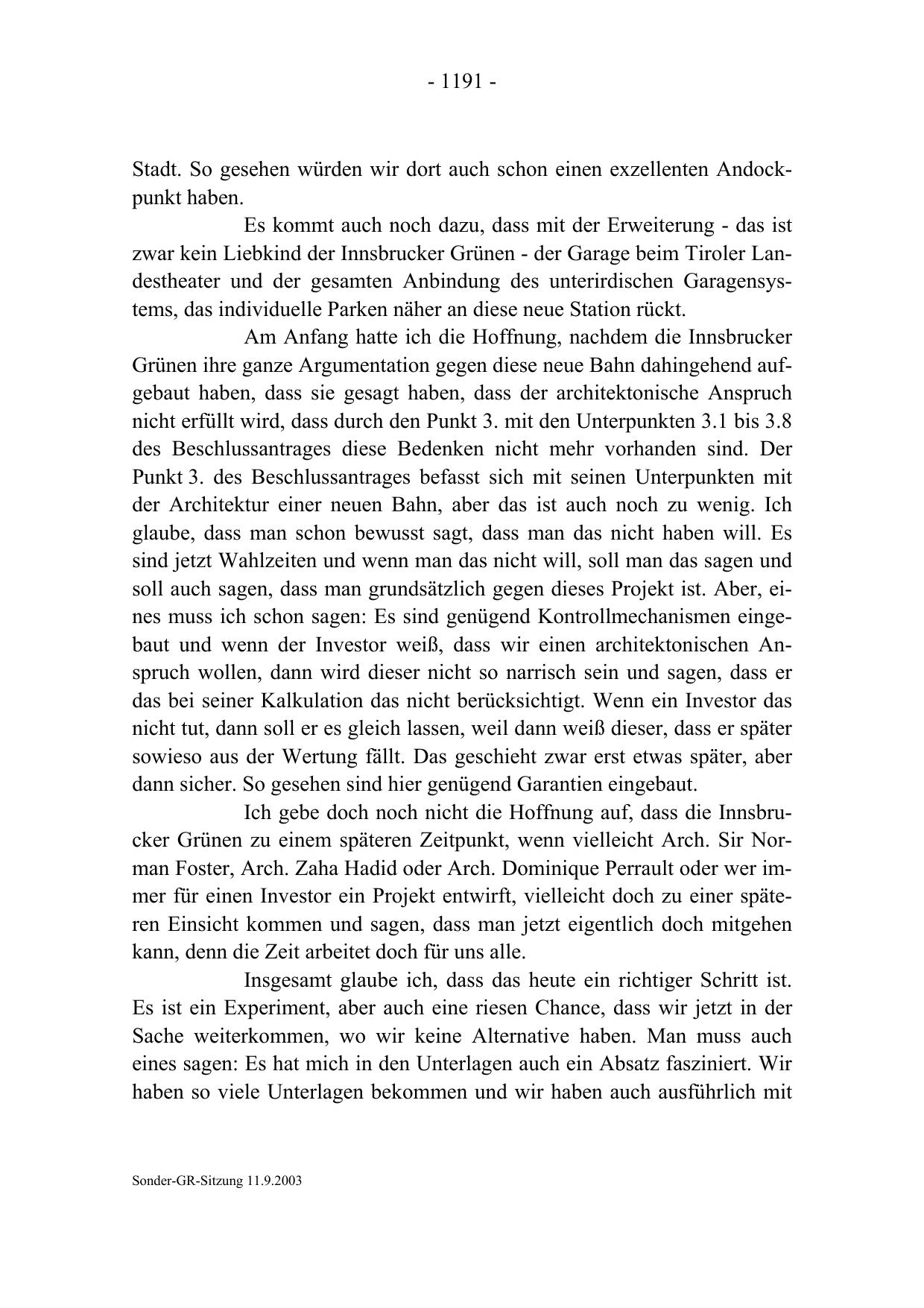 Ich gebe doch noch nicht die Hoffnung auf, dass die Innsbrucker Grünen zu einem späteren Zeitpunkt, wenn vielleicht Arch. Sir Norman Foster, Arch. Zaha Hadid oder Arch. Dominique Perrault oder wer immer für einen Investor ein Projekt entwirft, vielleicht doch zu einer späteren Einsicht kommen und sagen, dass man jetzt eigentlich doch mitgehen