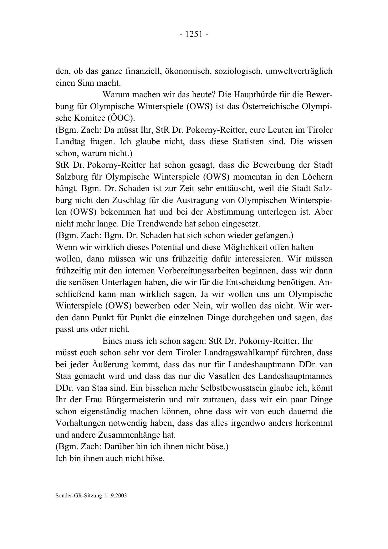 hängt. Bgm. Dr. Schaden ist zur Zeit sehr enttäuscht, weil die Stadt Salzburg nicht den Zuschlag für die Austragung von Olympischen Winterspielen (OWS) bekommen hat und bei der Abstimmung unterlegen ist. Aber