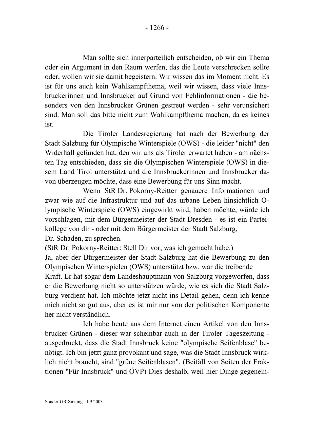 Ich habe heute aus dem Internet einen Artikel von den Innsbrucker Grünen - dieser war scheinbar auch in der Tiroler Tageszeitung ausgedruckt, dass die Stadt Innsbruck keine "olympische Seifenblase" benötigt. Ich bin jetzt ganz provokant und sage, was die Stadt Innsbruck wirklich nicht braucht, sind "grüne Seifenblasen". (Beifall von Seiten der Fraktionen "Für Innsbruck" und ÖVP) Dies deshalb, weil hier Dinge gegenein-