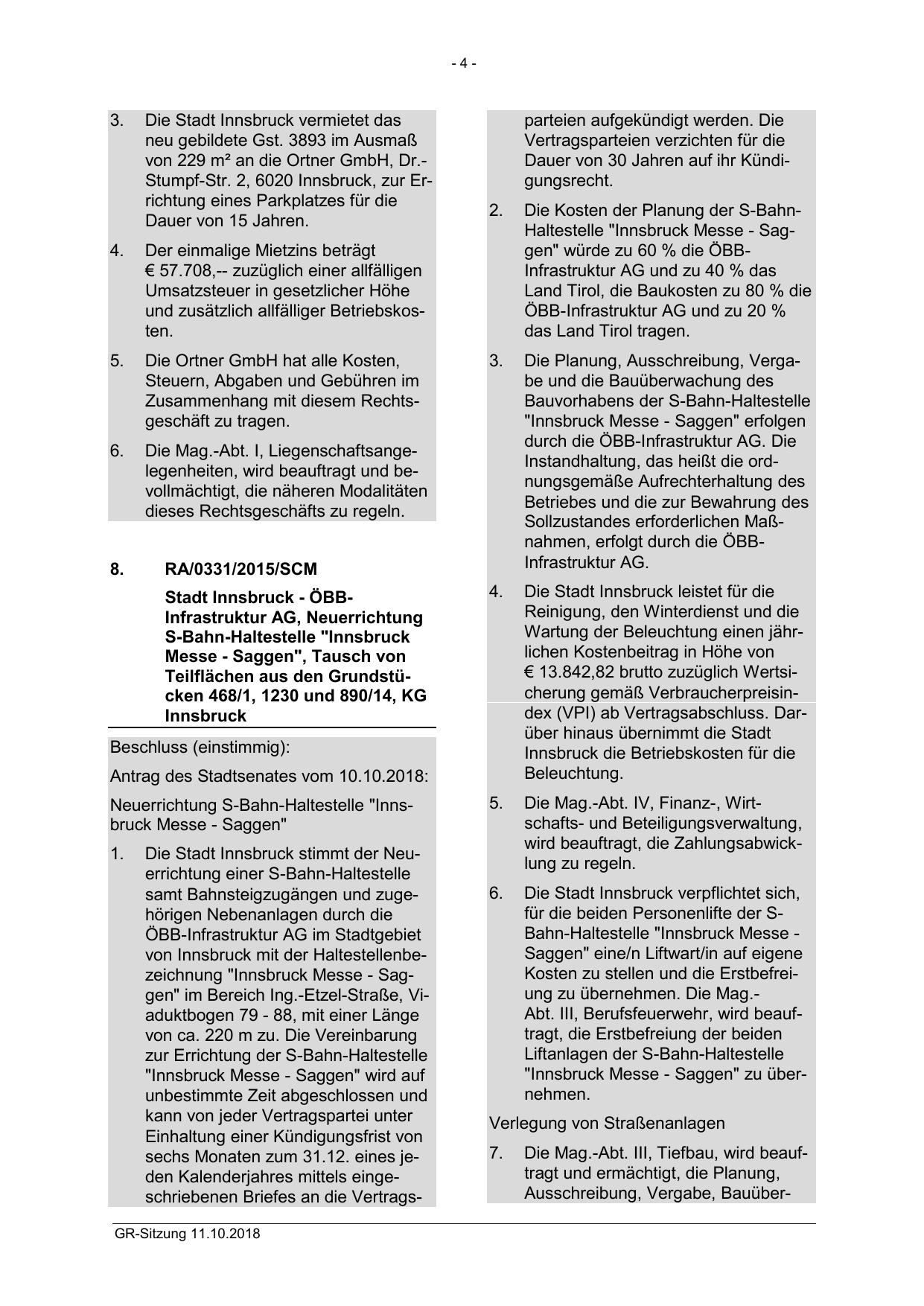 Die Kosten der Planung der S-BahnHaltestelle "Innsbruck Messe - Saggen" würde zu 60 % die ÖBBInfrastruktur AG und zu 40 % das