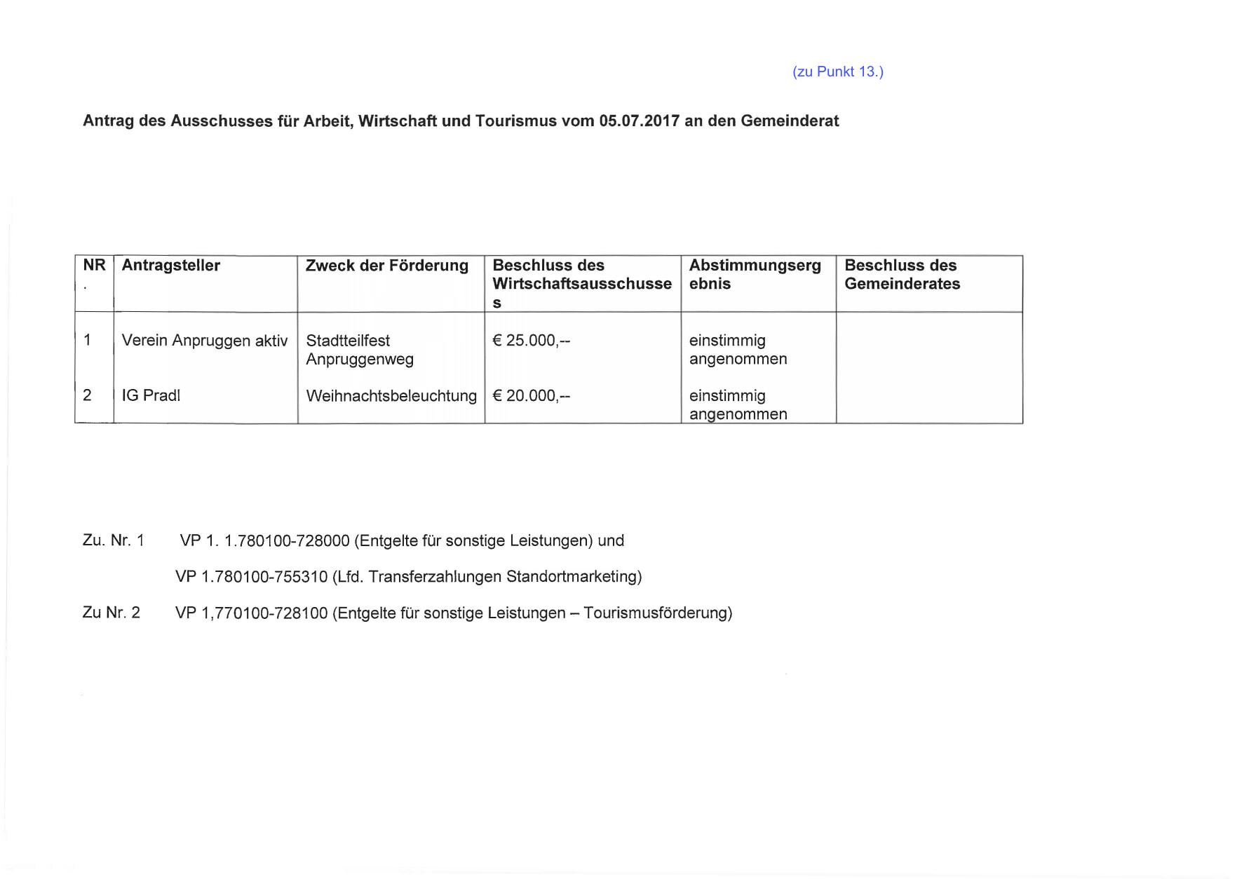 Antrag des Ausschusses für Arbeit, Wirtschaft und Tourismus vom 05.07.2017 an den Gemeinderat