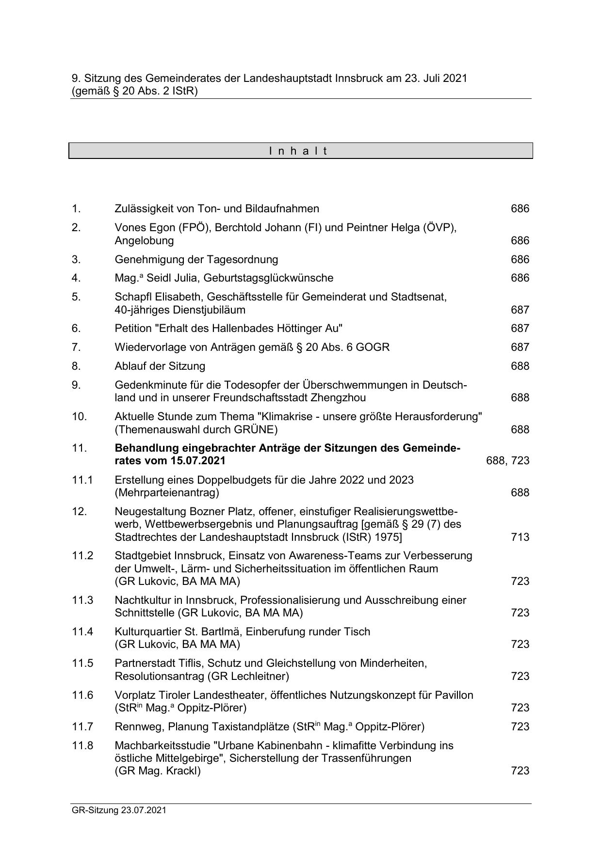 9. Sitzung des Gemeinderates der Landeshauptstadt Innsbruck am 23. Juli 2021