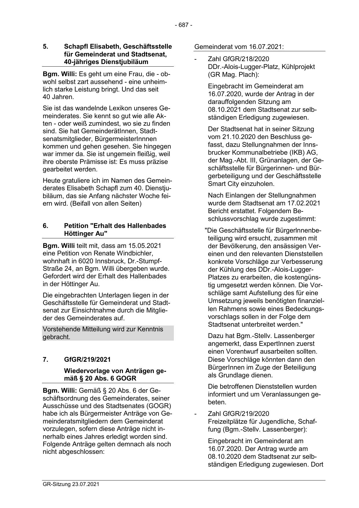 Bgm. Willi: Gemäß § 20 Abs. 6 der Geschäftsordnung des Gemeinderates, seiner