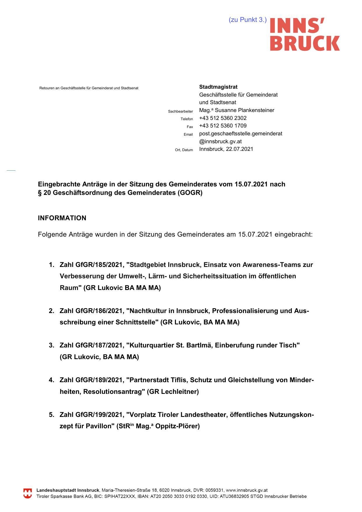2. Zahl GfGR/186/2021, "Nachtkultur in Innsbruck, Professionalisierung und Ausschreibung einer Schnittstelle" (GR Lukovic, BA MA MA)
