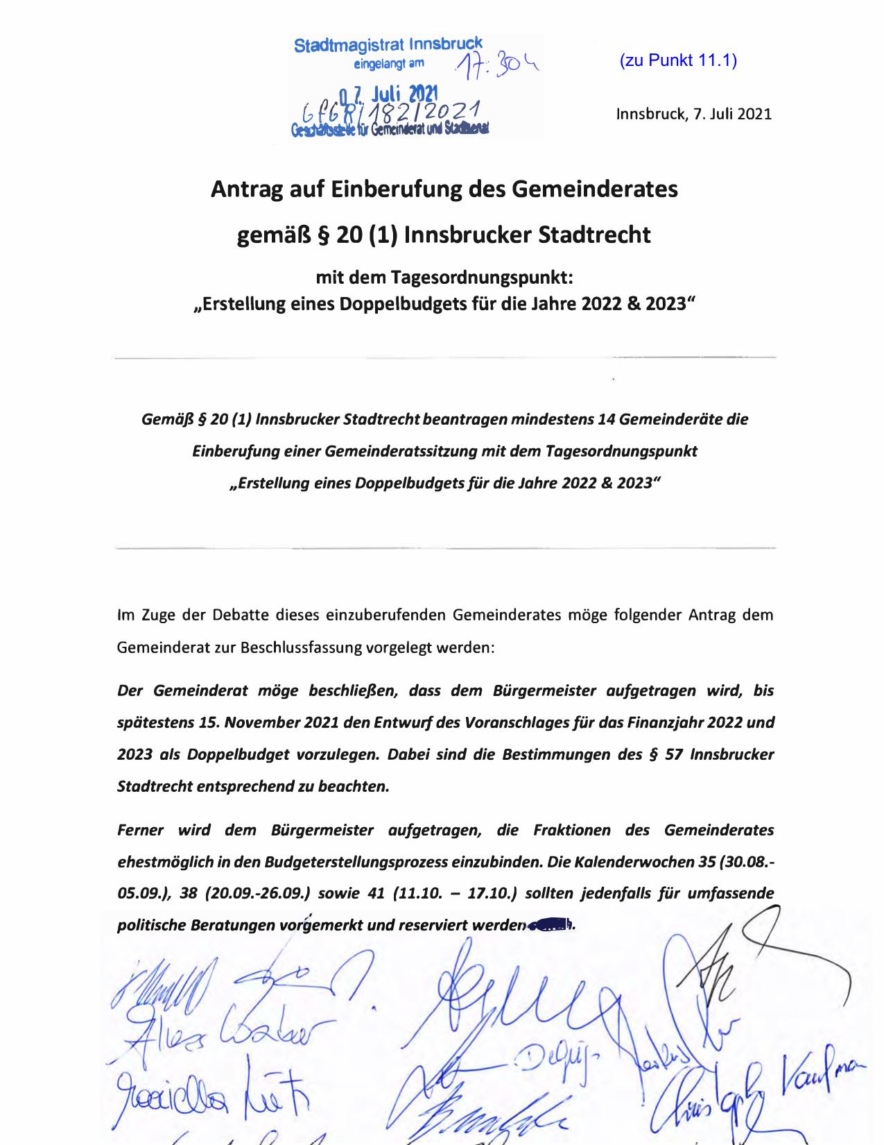 Gemäß § 20 (1) lnnsbrucker Stadtrecht beantragen mindestens 14 Gemeinderäte die