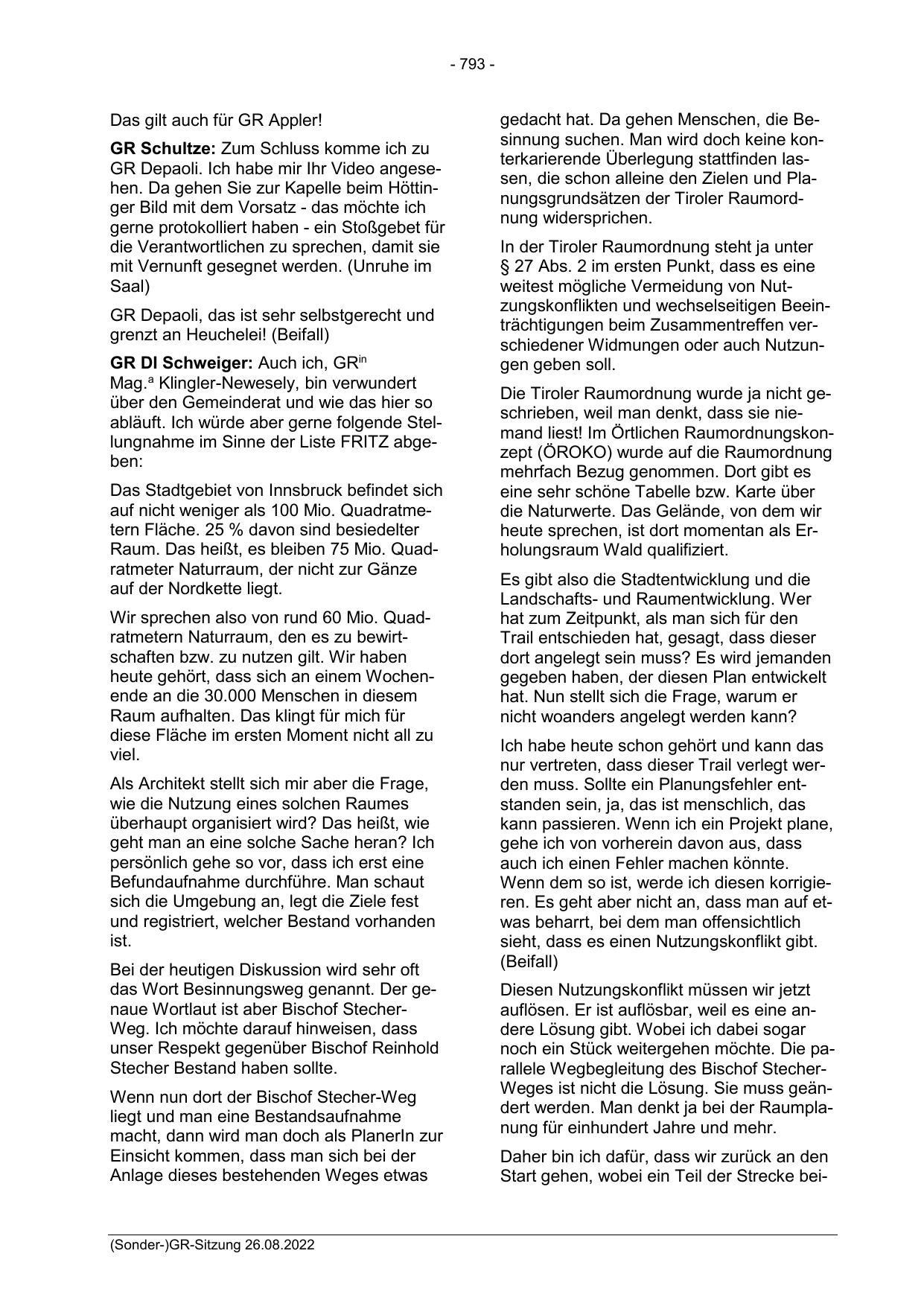 gedacht hat. Da gehen Menschen, die Besinnung suchen. Man wird doch keine konterkarierende Überlegung stattfinden lassen, die schon alleine den Zielen und Planungsgrundsätzen der Tiroler Raumordnung widersprichen.