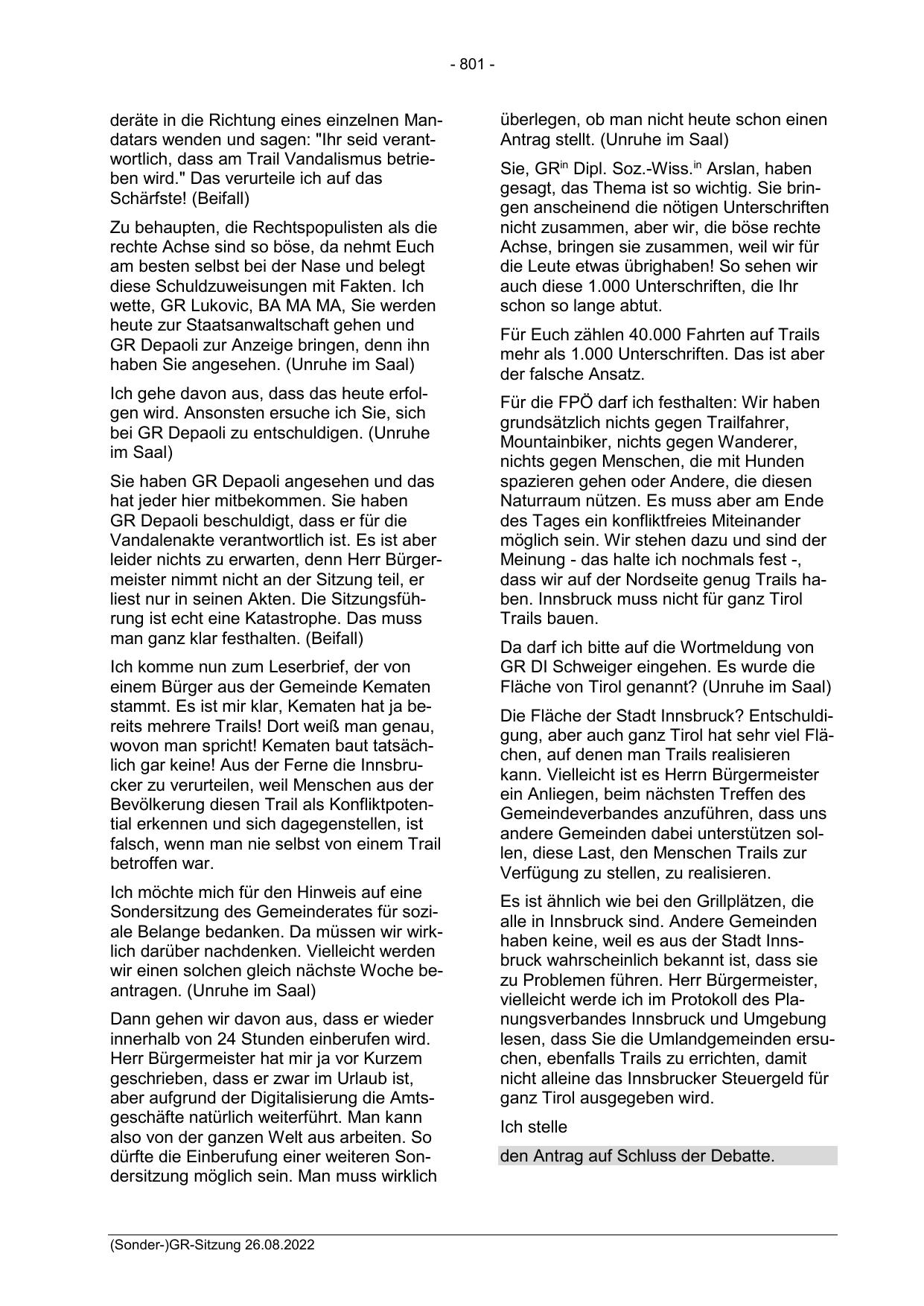 deräte in die Richtung eines einzelnen Mandatars wenden und sagen: "Ihr seid verantwortlich, dass am Trail Vandalismus betrieben wird." Das verurteile ich auf das