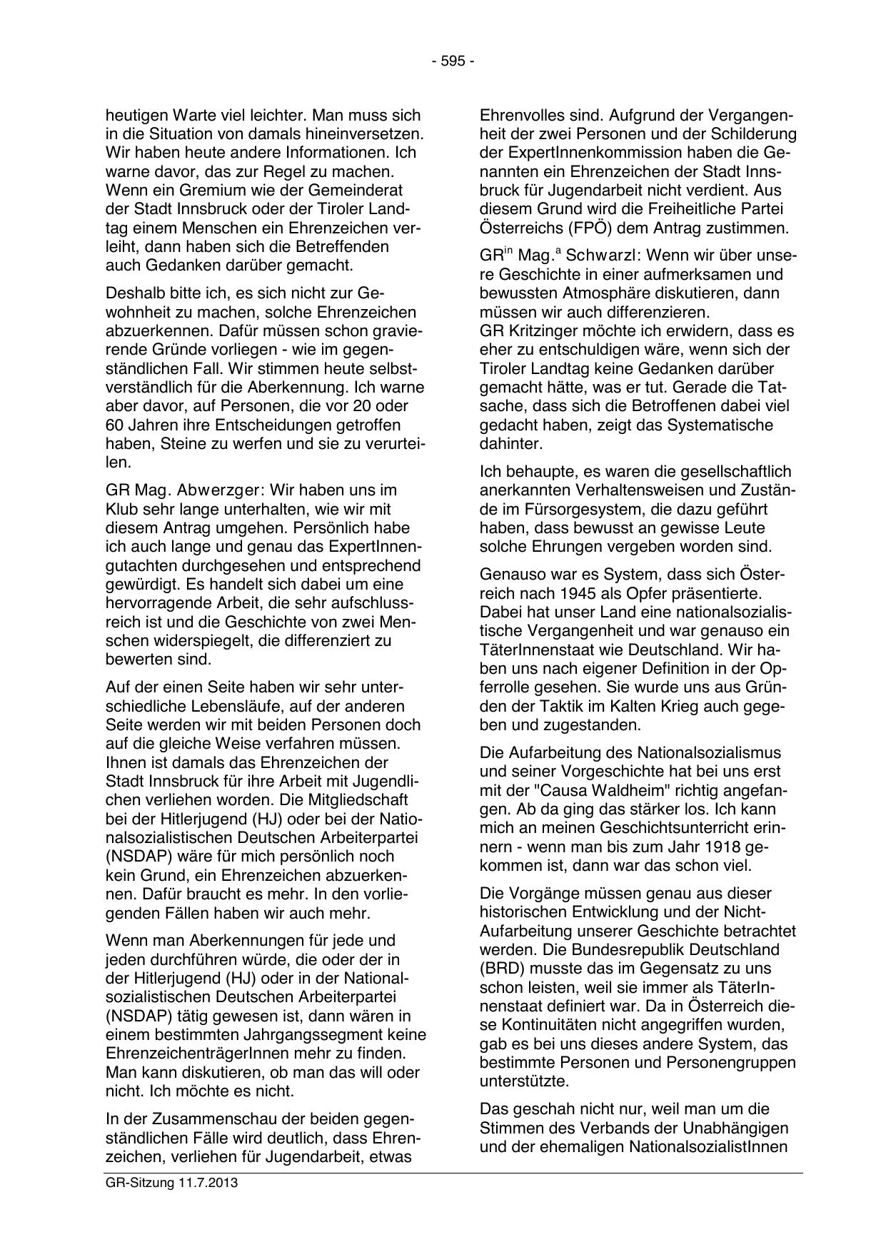 der ExpertInnenkommission haben die Genannten ein Ehrenzeichen der Stadt Innsbruck für Jugendarbeit nicht verdient. Aus