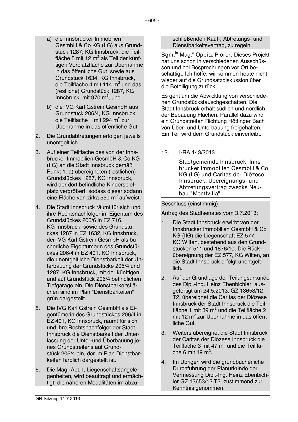 GesmbH & Co KG (IIG) aus Grundstück 1287, KG Innsbruck, die Teilfläche 5 mit 12 m2 als Teil der künftigen Vorplatzfläche zur Übernahme