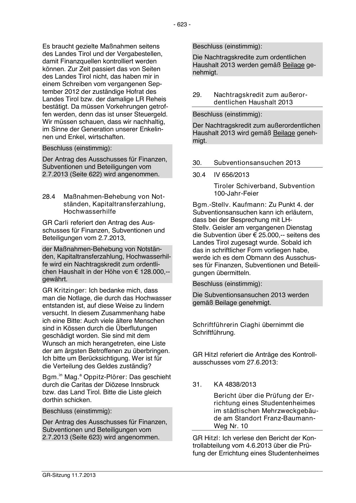 GR Hitzl referiert die Anträge des Kontrollausschusses vom 27.6.2013: