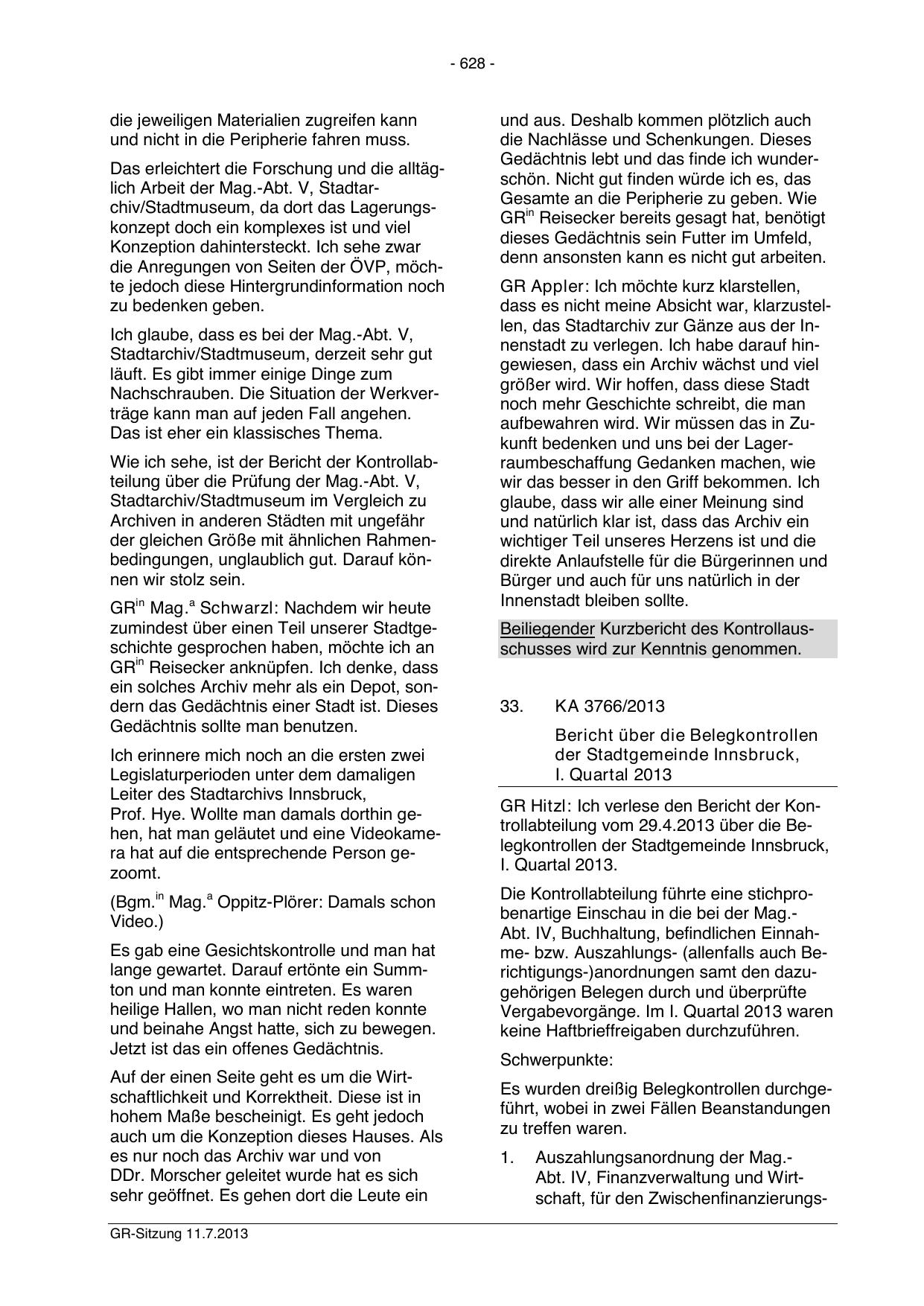 GR Hitzl: Ich verlese den Bericht der Kontrollabteilung vom 29.4.2013 über die Belegkontrollen der Stadtgemeinde Innsbruck,