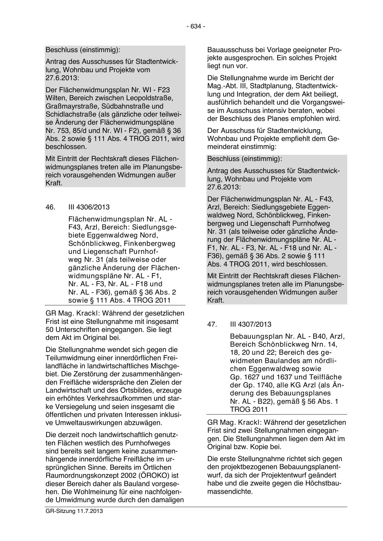 Nr. 31 (als teilweise oder gänzliche Änderung der Flächenwidmungspläne Nr. AL F1, Nr. AL - F3, Nr. AL - F18 und Nr. AL F36), gemäß § 36 Abs. 2 sowie § 111