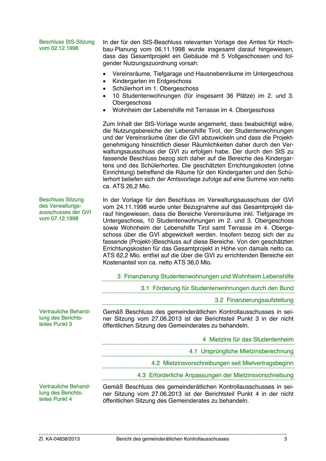 Gemäß Beschluss des gemeinderätlichen Kontrollausschusses in seiner Sitzung vom 27.06.2013 ist der Berichtsteil Punkt 3 in der nicht
