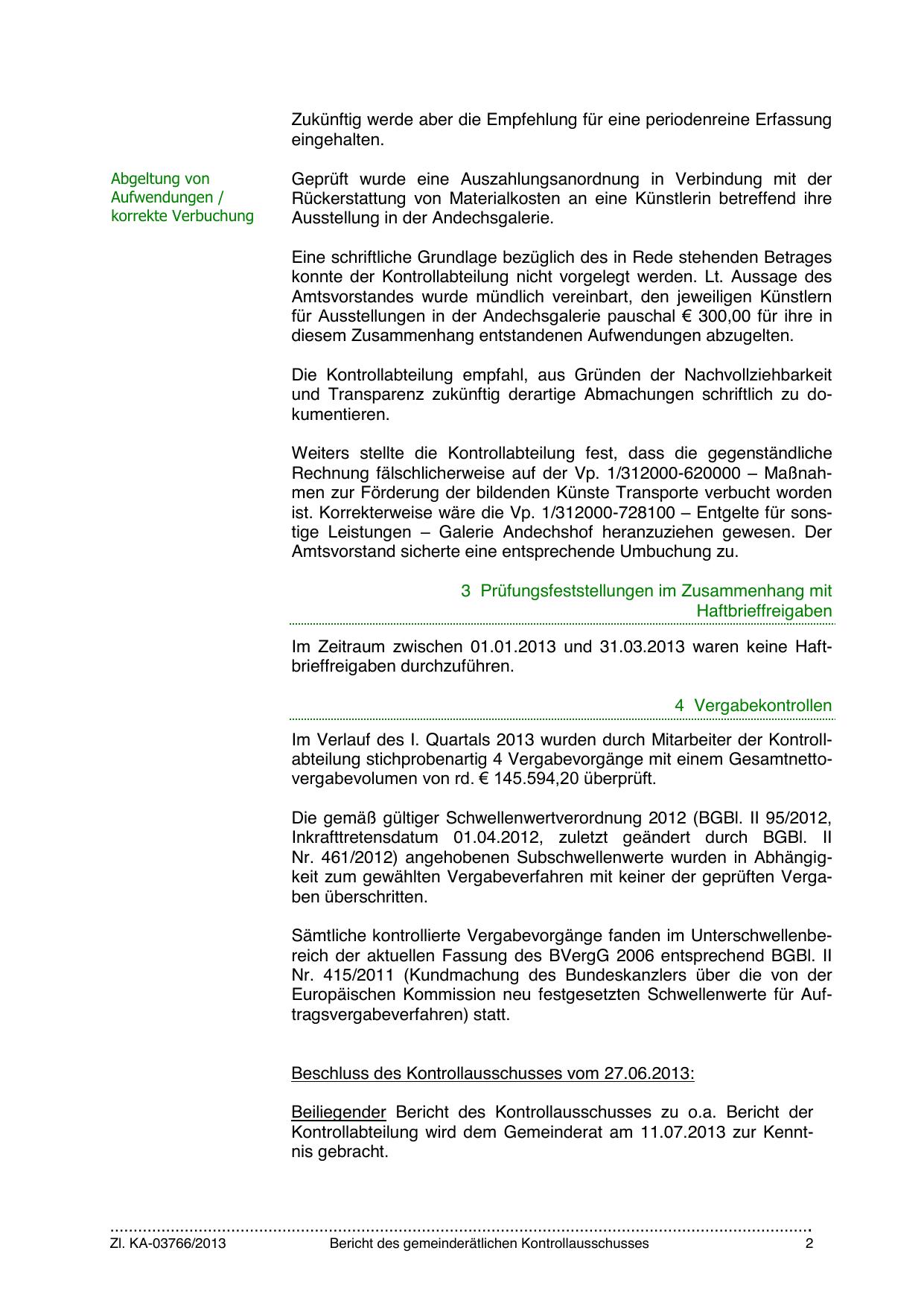 Im Verlauf des I. Quartals 2013 wurden durch Mitarbeiter der Kontrollabteilung stichprobenartig 4 Vergabevorgänge mit einem Gesamtnettovergabevolumen von rd. € 145.594,20 überprüft.