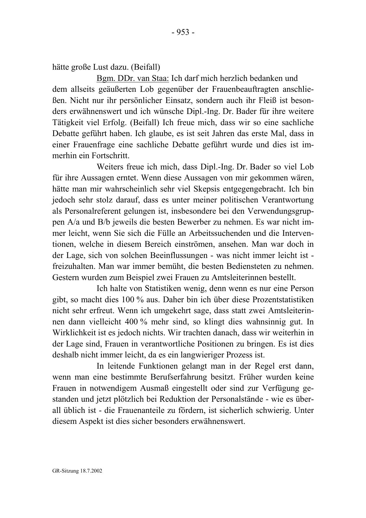 dem allseits geäußerten Lob gegenüber der Frauenbeauftragten anschließen. Nicht nur ihr persönlicher Einsatz, sondern auch ihr Fleiß ist besonders erwähnenswert und ich wünsche Dipl.-Ing. Dr. Bader für ihre weitere