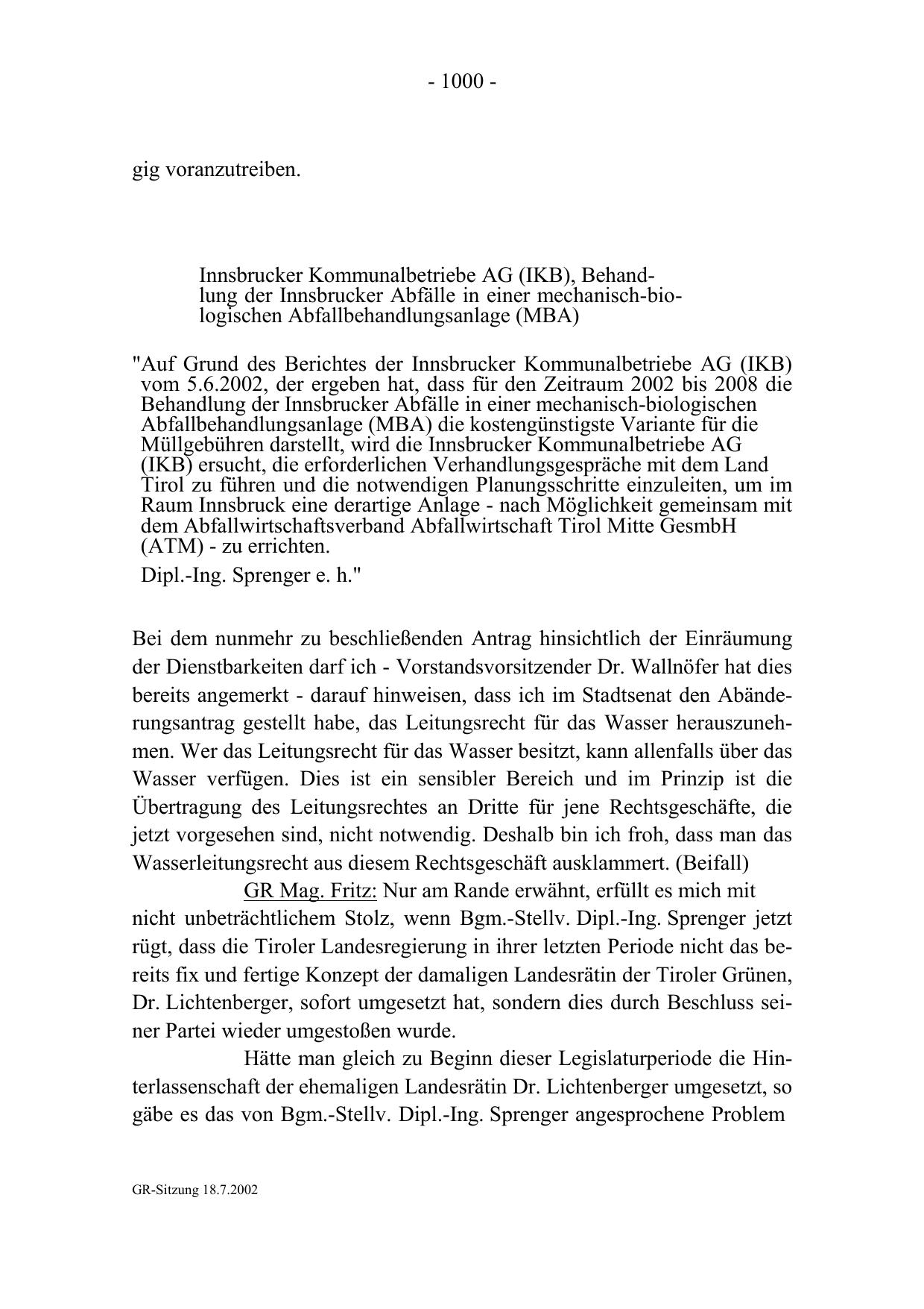 Dr. Lichtenberger, sofort umgesetzt hat, sondern dies durch Beschluss seiner Partei wieder umgestoßen wurde.