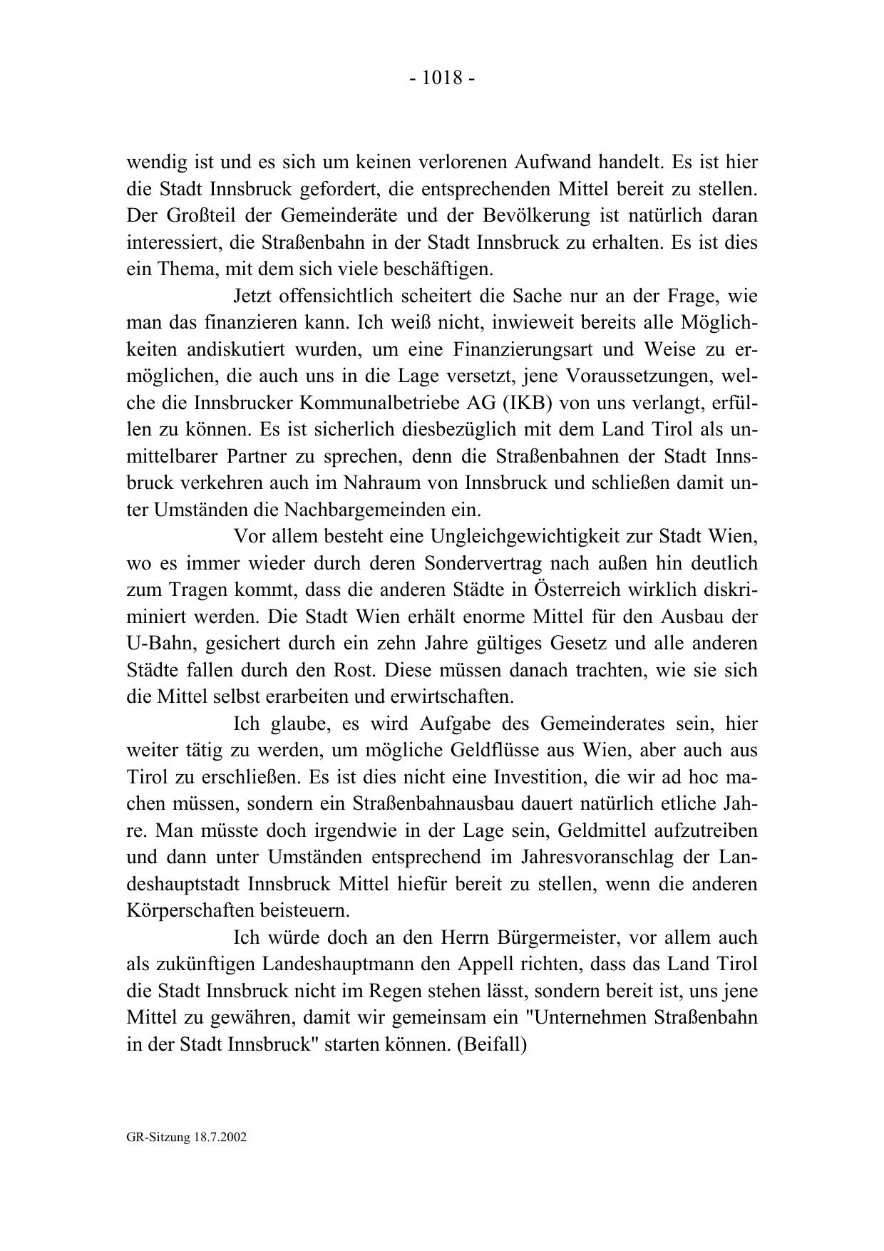man das finanzieren kann. Ich weiß nicht, inwieweit bereits alle Möglichkeiten andiskutiert wurden, um eine Finanzierungsart und Weise zu ermöglichen, die auch uns in die Lage versetzt, jene Voraussetzungen, welche die Innsbrucker Kommunalbetriebe AG (IKB) von uns verlangt, erfüllen zu können. Es ist sicherlich diesbezüglich mit dem Land Tirol als unmittelbarer Partner zu sprechen, denn die Straßenbahnen der Stadt Innsbruck verkehren auch im Nahraum von Innsbruck und schließen damit unter Umständen die Nachbargemeinden ein.