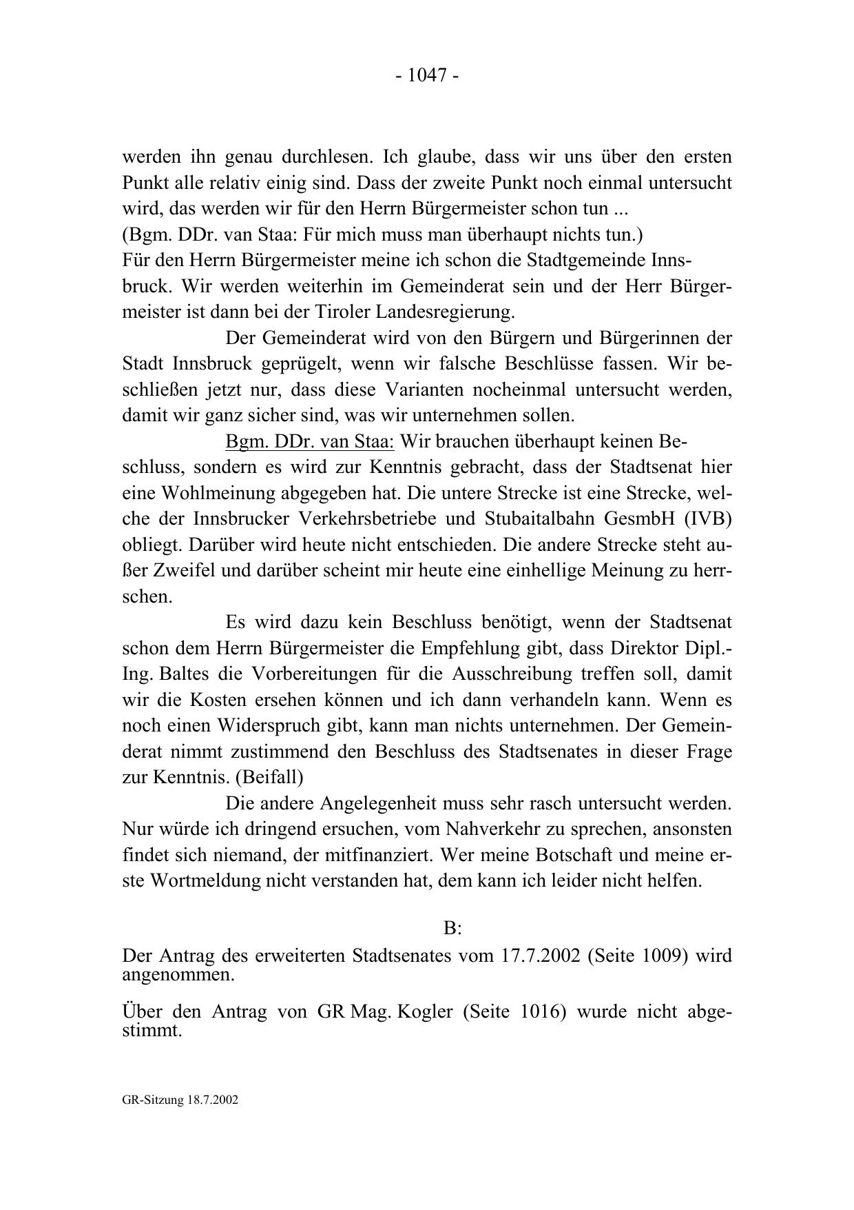 Bgm. DDr. van Staa: Wir brauchen überhaupt keinen Beschluss, sondern es wird zur Kenntnis gebracht, dass der Stadtsenat hier