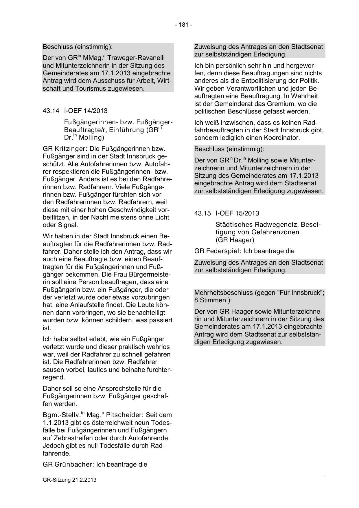 Wir haben in der Stadt Innsbruck einen Beauftragten für die Radfahrerinnen bzw. Radfahrer. Daher stelle ich den Antrag, dass wir