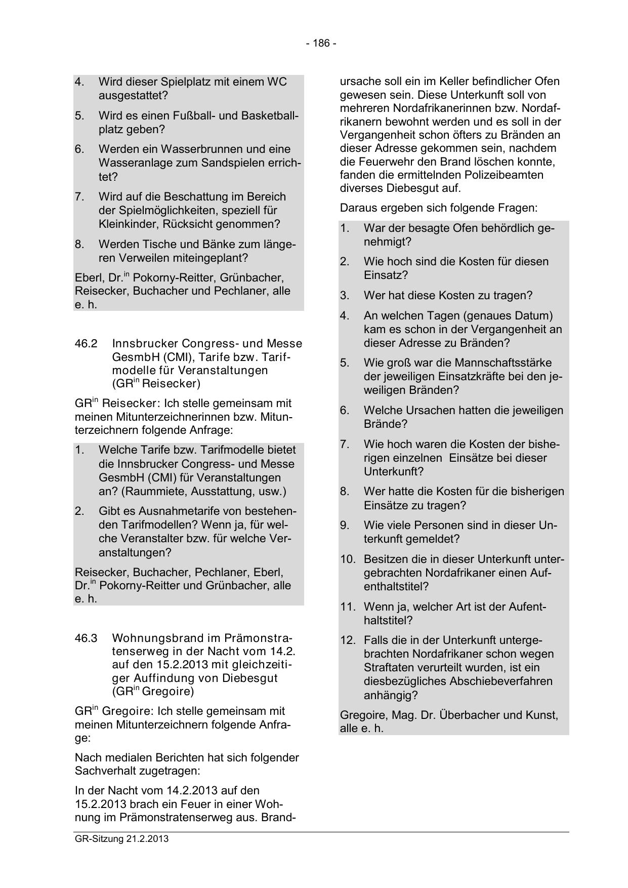 15.2.2013 brach ein Feuer in einer Wohnung im Prämonstratenserweg aus. BrandGR-Sitzung 21.2.2013