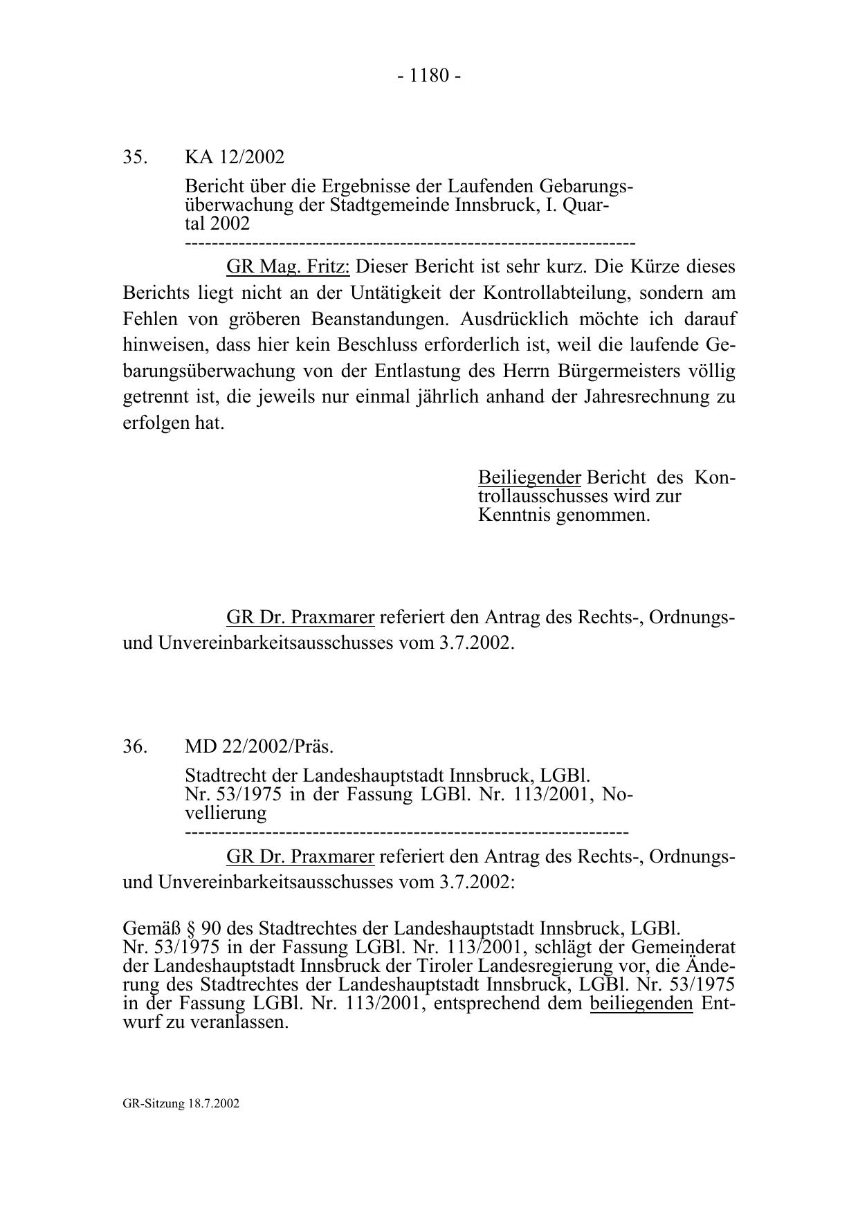 -----------------------------------------------------------------GR Dr. Praxmarer referiert den Antrag des Rechts-, Ordnungsund Unvereinbarkeitsausschusses vom 3.7.2002: