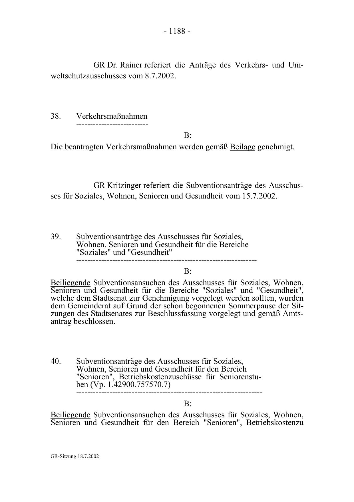 GR Kritzinger referiert die Subventionsanträge des Ausschusses für Soziales, Wohnen, Senioren und Gesundheit vom 15.7.2002.