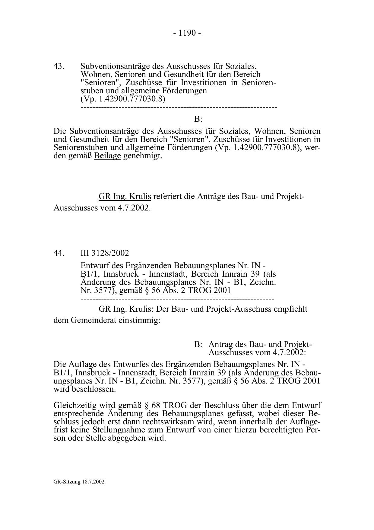 GR Ing. Krulis referiert die Anträge des Bau- und ProjektAusschusses vom 4.7.2002.