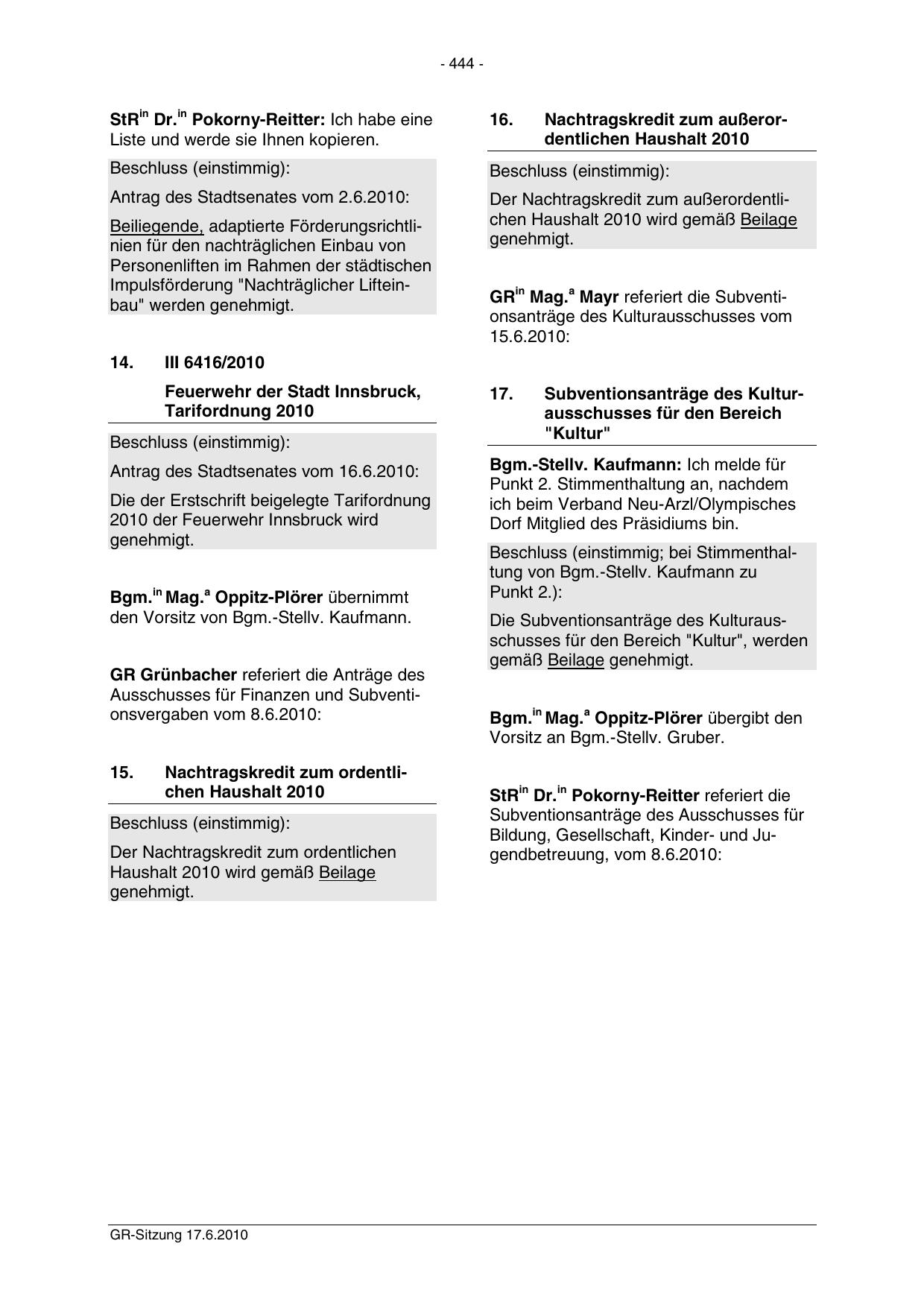 Ausschusses für Finanzen und Subventionsvergaben vom 8.6.2010: