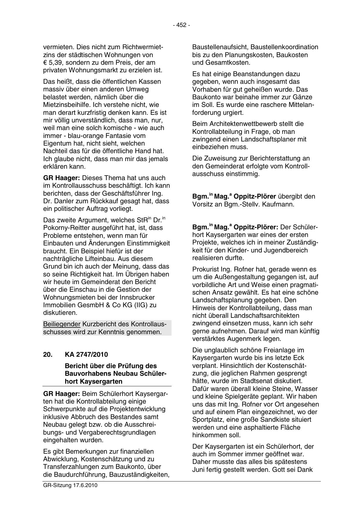 den Gemeinderat erfolgte vom Kontrollausschuss einstimmig.