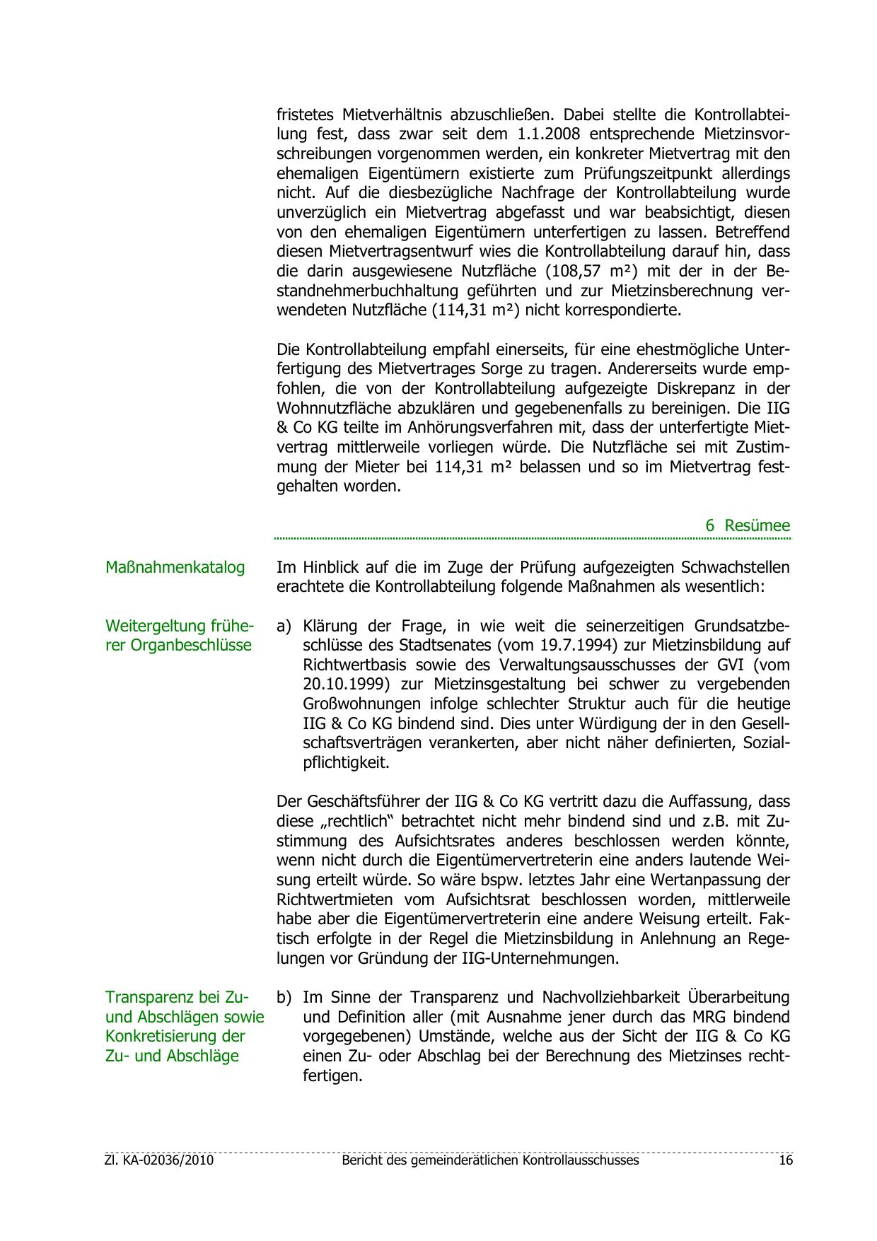 Die Kontrollabteilung empfahl einerseits, für eine ehestmögliche Unterfertigung des Mietvertrages Sorge zu tragen. Andererseits wurde empfohlen, die von der Kontrollabteilung aufgezeigte Diskrepanz in der