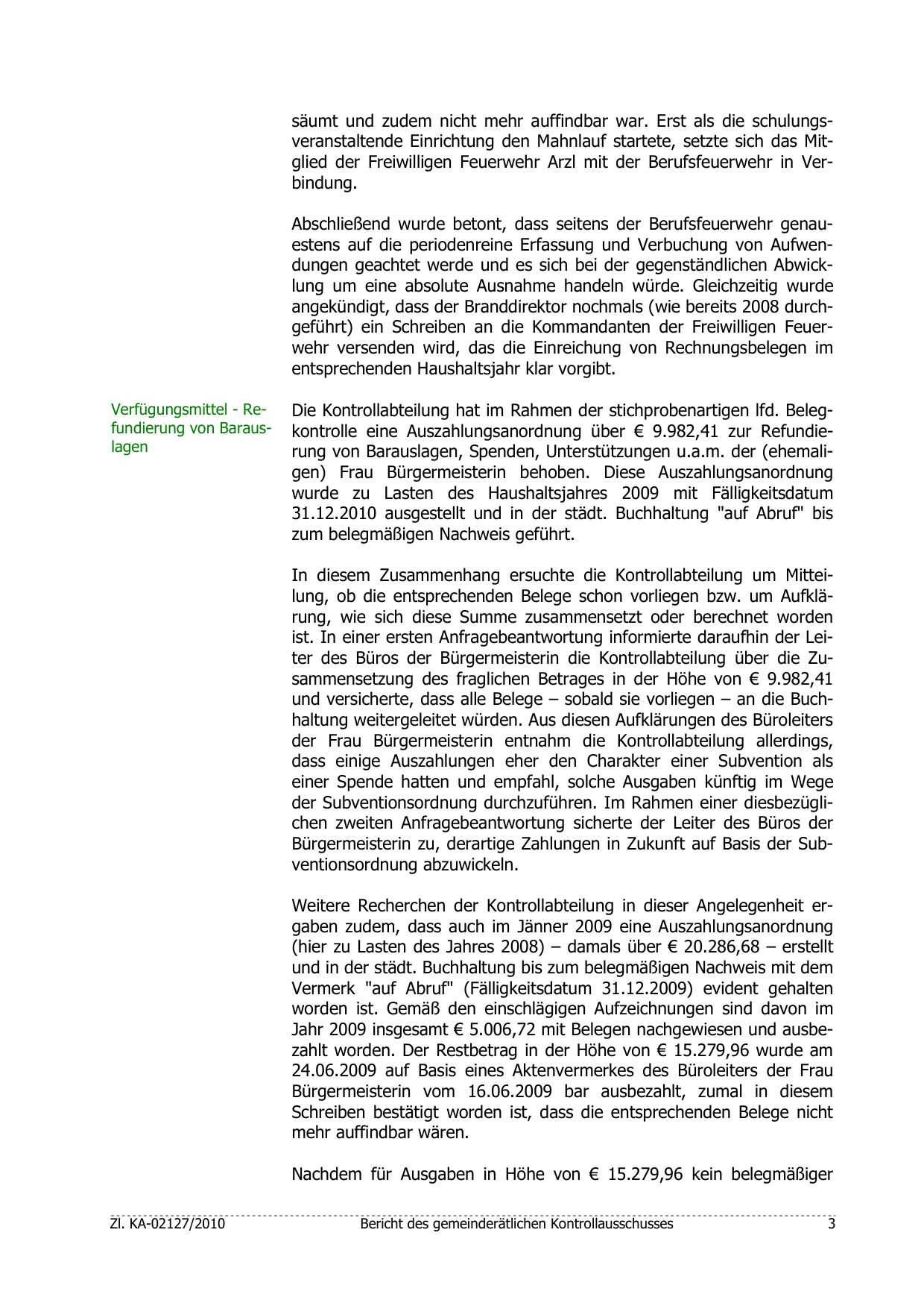 Die Kontrollabteilung hat im Rahmen der stichprobenartigen lfd. Belegkontrolle eine Auszahlungsanordnung über € 9.982,41 zur Refundierung von Barauslagen, Spenden, Unterstützungen u.a.m. der (ehemaligen) Frau Bürgermeisterin behoben. Diese Auszahlungsanordnung