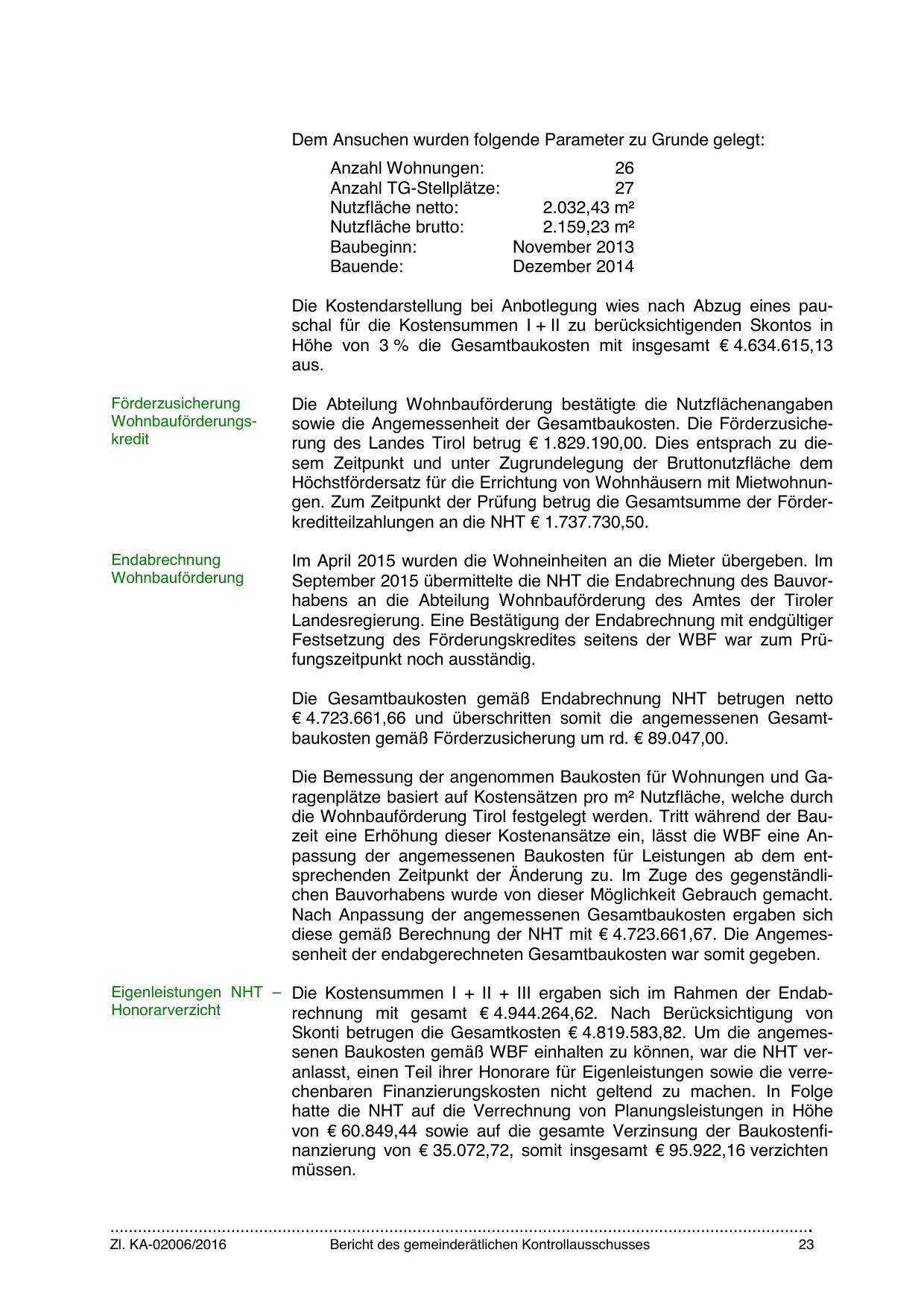 September 2015 übermittelte die NHT die Endabrechnung des Bauvorhabens an die Abteilung Wohnbauförderung des Amtes der Tiroler