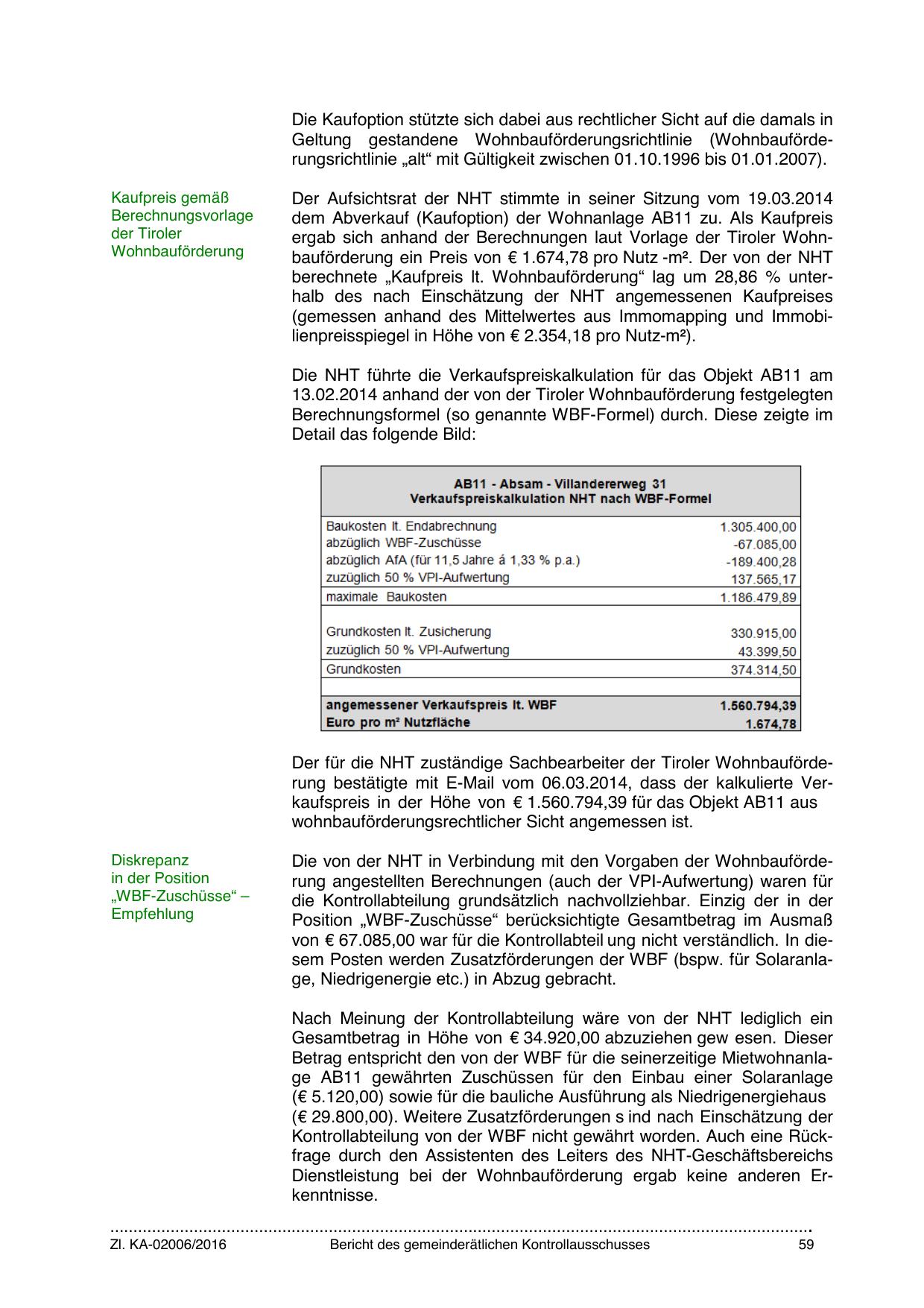 Der für die NHT zuständige Sachbearbeiter der Tiroler Wohnbauförderung bestätigte mit E-Mail vom 06.03.2014, dass der kalkulierte Verkaufspreis in der Höhe von € 1.560.794,39 für das Objekt AB11 aus