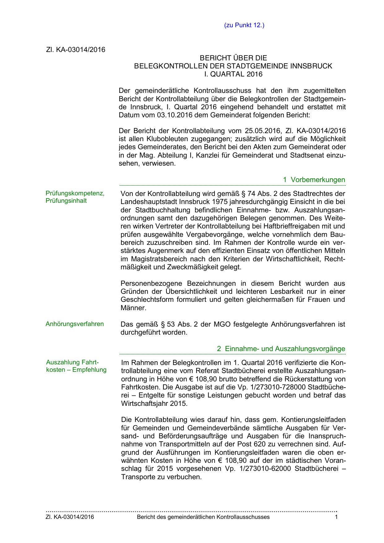 Bericht der Kontrollabteilung über die Belegkontrollen der Stadtgemeinde Innsbruck, I. Quartal 2016 eingehend behandelt und erstattet mit