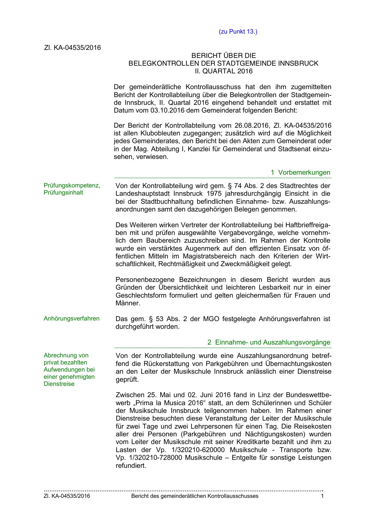 Bericht der Kontrollabteilung über die Belegkontrollen der Stadtgemeinde Innsbruck, II. Quartal 2016 eingehend behandelt und erstattet mit