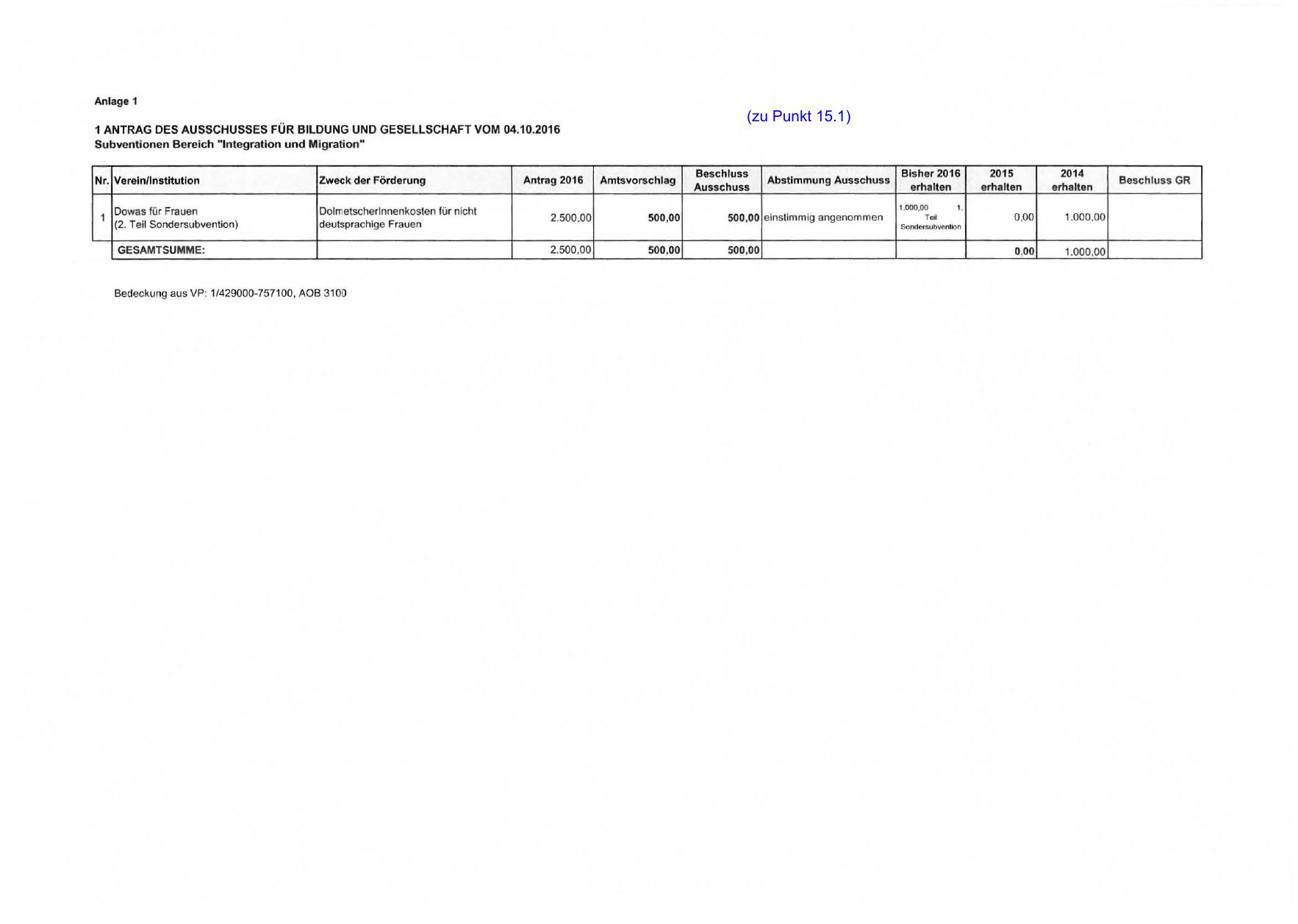 1 AN TRAG DES AUSSCHUSSES FÜR BILDUNG UND GESELLSC HAFT VOM 04.10.2016