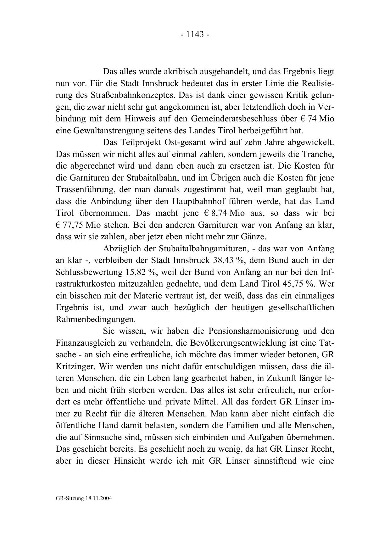 nun vor. Für die Stadt Innsbruck bedeutet das in erster Linie die Realisierung des Straßenbahnkonzeptes. Das ist dank einer gewissen Kritik gelungen, die zwar nicht sehr gut angekommen ist, aber letztendlich doch in Verbindung mit dem Hinweis auf den Gemeinderatsbeschluss über € 74 Mio