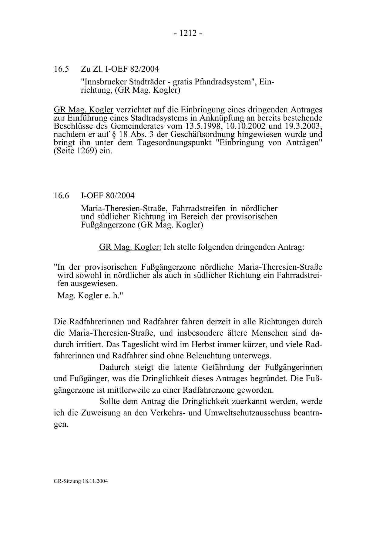 "Innsbrucker Stadträder - gratis Pfandradsystem", Einrichtung, (GR Mag. Kogler)