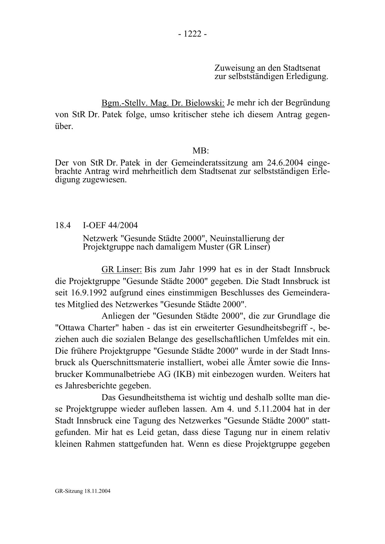 Der von StR Dr. Patek in der Gemeinderatssitzung am 24.6.2004 eingebrachte Antrag wird mehrheitlich dem Stadtsenat zur selbstständigen Erledigung zugewiesen.