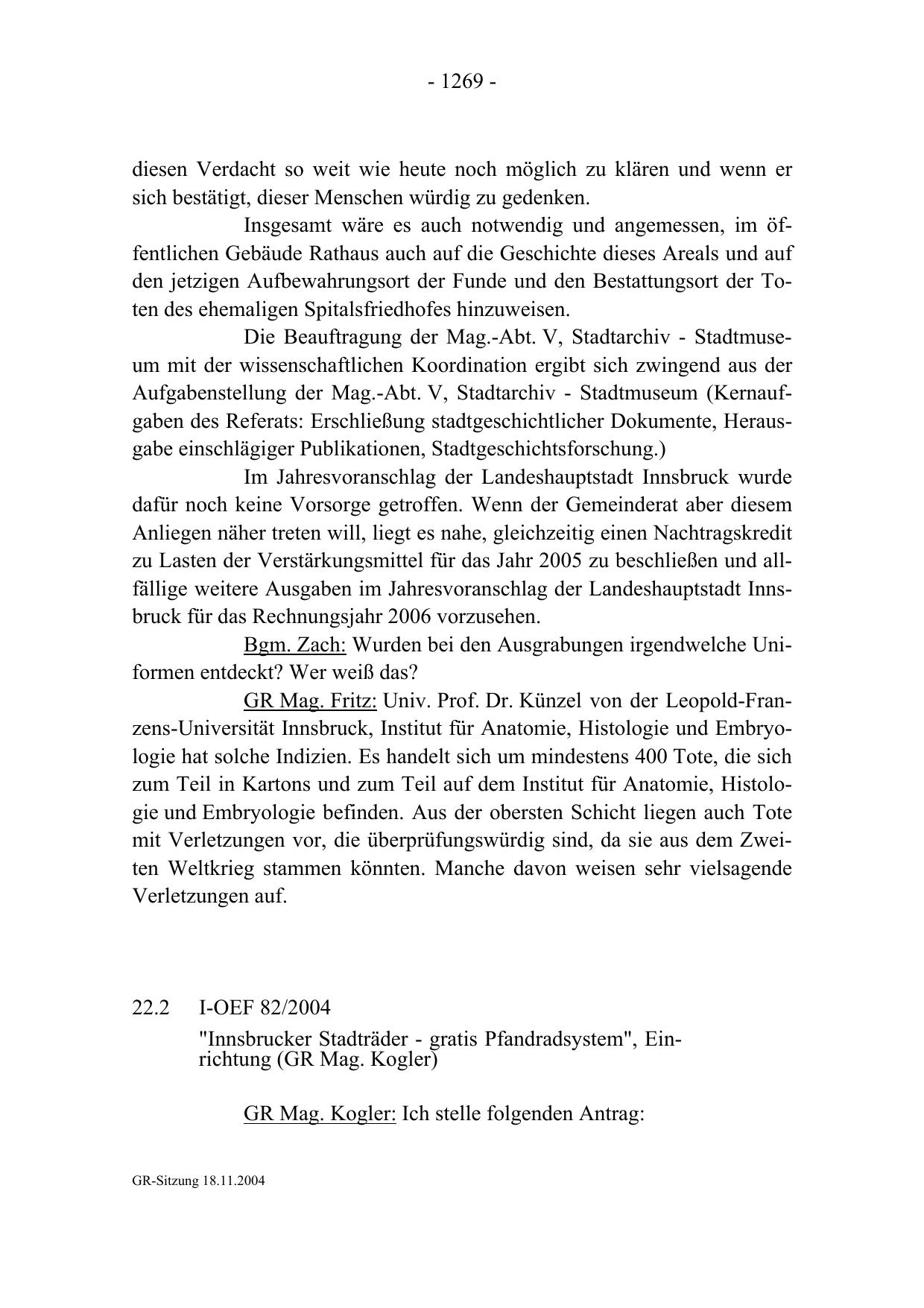 GR Mag. Fritz: Univ. Prof. Dr. Künzel von der Leopold-Franzens-Universität Innsbruck, Institut für Anatomie, Histologie und Embryologie hat solche Indizien. Es handelt sich um mindestens 400 Tote, die sich
