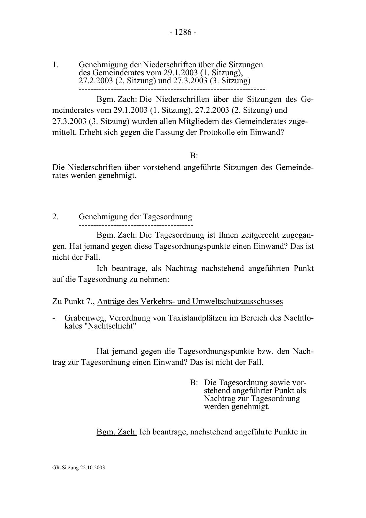 ---------------------------------------Bgm. Zach: Die Tagesordnung ist Ihnen zeitgerecht zugegangen. Hat jemand gegen diese Tagesordnungspunkte einen Einwand? Das ist