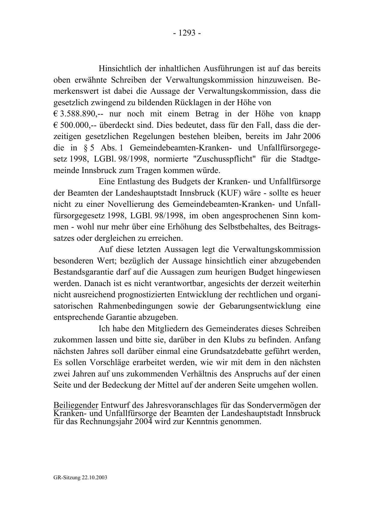 die in § 5 Abs. 1 Gemeindebeamten-Kranken- und Unfallfürsorgegesetz 1998, LGBl. 98/1998, normierte "Zuschusspflicht" für die Stadtgemeinde Innsbruck zum Tragen kommen würde.