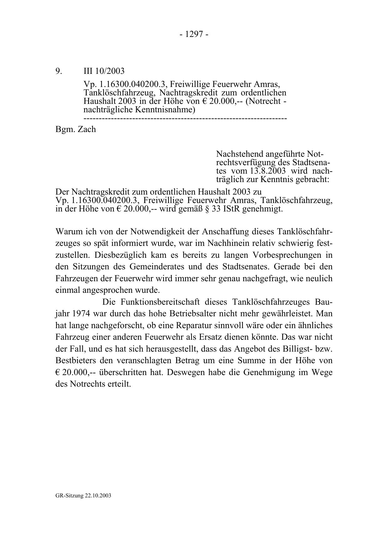 Haushalt 2003 in der Höhe von € 20.000,-- (Notrecht nachträgliche Kenntnisnahme)
