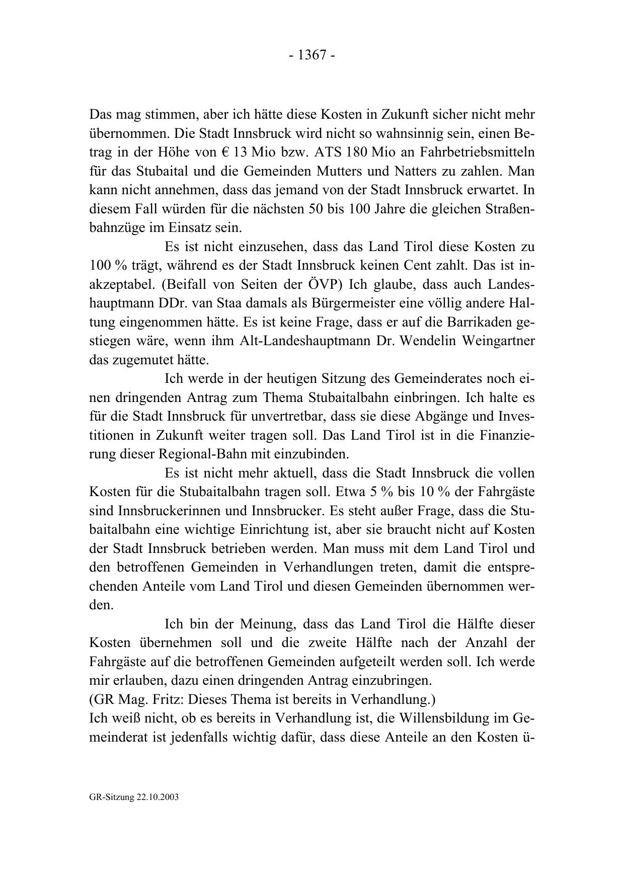 100 % trägt, während es der Stadt Innsbruck keinen Cent zahlt. Das ist inakzeptabel. (Beifall von Seiten der ÖVP) Ich glaube, dass auch Landeshauptmann DDr. van Staa damals als Bürgermeister eine völlig andere Haltung eingenommen hätte. Es ist keine Frage, dass er auf die Barrikaden gestiegen wäre, wenn ihm Alt-Landeshauptmann Dr. Wendelin Weingartner